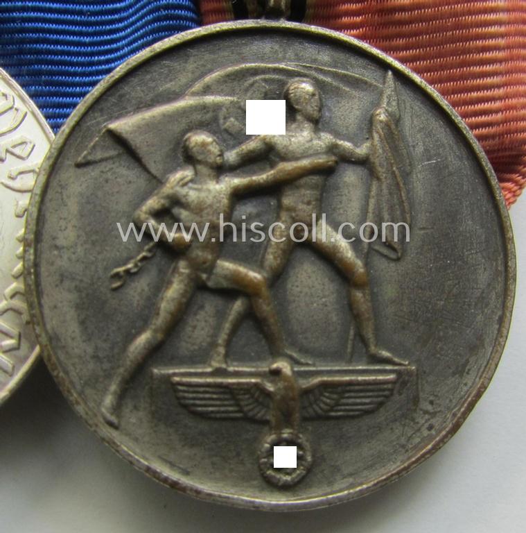 This is a truly very decorative - and in this combination with certainty not that easily found! - three-pieced (WWII- ie. TR-period) medal-bar (ie. 'Ordenspange') that respectively shows an: 'Eisernes Kreuz II. Klasse' (or: iron-cross second class), a: 'WH (Heeres o. KM) Dienstauszeichnung 4. Stufe' (as was intended for 4 years of loyal-service) and that shows a detailed, silver-toned eagle-device period-attached and a: 'Medaille zur Erinnerung an den 13. März 1938' (or: Austrian 'Anschluss'-medal) as was awarded to all members of the armed forces that participated in the German occupation of Austria that started on: '13. März 1938', all three medals coming in an overall very nice- (albeit just minimally used and/or worn-), condition. All three medals are nicely preserved examples that seem to have never been cleaned nor polished: both come in an equally minimally tarnished- ie. dusty condition and naturally also come mounted onto their period ribbons. The iron cross - which is an attractive example that was produced by a by me unidentified the maker (ie. 'Hersteller') - was with certainty never cleaned and has a very nice and/or attractive age-patina: it has just a minimally tarnished appearance (as can be seen on the pictures). The cross retains truly very nice and/or pronounced detail and has a very nicely preserved, black-finished (ie. somewhat 'matted'- ie. satin-like) core: it is totally void of any paint-damage or alike. The 'WH-Dienstauszeichnung 4. Stufe' retains nice details and has a great ie. only minimally darkened- ie. tarnished age-patina: it retains all of its somewhat 'matted'- and/or: silver-toned finish (as can be noticed on the pictures). The 'Anschluss'-medal retains also all of its original, silver-toned finish: it is also a tiny bit dirty ie. tarnished, simply caused by minimal wear and/or decades of storage (as can be noticed on the pictures). The 'Ordenspange' comes naturally mounted onto its functional pin- (ie. catch-) set-up and is neatly 'backed' with a piece of field-grey wool as is more often seen (as can be seen on the pictures). The medal-bar was recently found at a private-household in Germany and was never before part of a collection. The 'Spange' is most certainly a period-compiled- and/or worn piece and is NOT a post-war compilation or alike: it originated as stated above from a private-household and was kept as such for decades. Simply a very attractive - and decorative! - 3-pieced, WH (Heeres o. Kriegsmarine) related medal-bar- ie. 'Ordenspange' that is in my opinion accordingly priced!