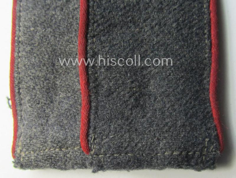 This is a neat - fully matching and just moderately used- and/or worn! - pair of WH (Luftwaffe), enlisted-mens'-type shoulderstraps as was piped in the bright-red- (ie. 'hochroter'-) coloured branchcolour as was specifically intended for usage by a: 'Soldat eines Flakartillerie-Regiments o. Abteilungs' (or: simple anti-aircraft soldier) and that comes in an overall nice- (ie. I deem just moderately used- ie. worn-), condition. The neat shoulderstraps - which measure approximately 10 cms. in length each and that come naturally mounted onto their functional tongues - are as stated piped in the neat bright-red- (ie. 'hochroter'-) branchcolour and have the desirable 'silk-like'-type piping attached (as can be seen on the pictures). The straps have the bluish-grey-coloured and/or 'smooth'-woolen-based 'upperdecks' and were with certainty intended as a: 'standard-issue'-type pair (as can be seen on the pictures). The straps show some minimal age ie. staining but are totally void of any damage or alike. Simply a great occasion to acquire a neat and just moderately used, enlisted-mens'-type LW-shoulderstrap-pair that was intended for a: 'Soldat eines Flakartillerie-Regiments o. Abteilungs'!