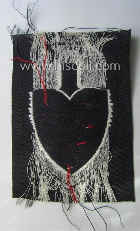 This is an attractive - and simply never used! - enlisted-mens'- (ie. NCOs'-) version of a so-called: RAD (ie. 'Reichsarbeitsdienst') sleeve-badge (or: 'Dienststellen-Abzeichen') bearing the specialist- ie. unit-designation: '356/6' (as was intended for a RAD-staff-member who served within the 356th district ie. 'Bezirk') and that comes in an overall very nice (ie. 'virtually mint- ie. unissued'- and/or simply never tunic-attached-), condition. These neat badges were worn on the upper-left sleeve of the mustard-coloured (EM- ie. NCO-type-) RAD-tunics and/or garments. The badge - which shows the red-coloured '356/6'-numerals on a white-coloured- and spade-shaped field - is neatly executed in so-called: 'BeVo'-weave-pattern and comes as 'straightly cut-off the role'. The patch shows a typical and nicely interwoven so-called: 'RADJ-Ges.Gesch.-G.e.W.'-designation on its top and is just a tiny bit wrinkled caused by decades of storage. This badge originates from a smaller collection of RAD-cloth-insignia I recently acquired for the web-site. I deem that this attractive RAD-insignia-piece is accordingly priced!