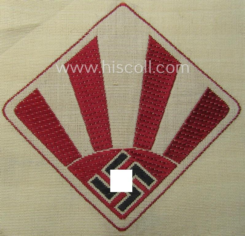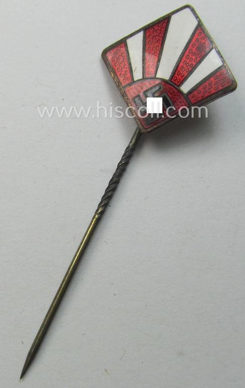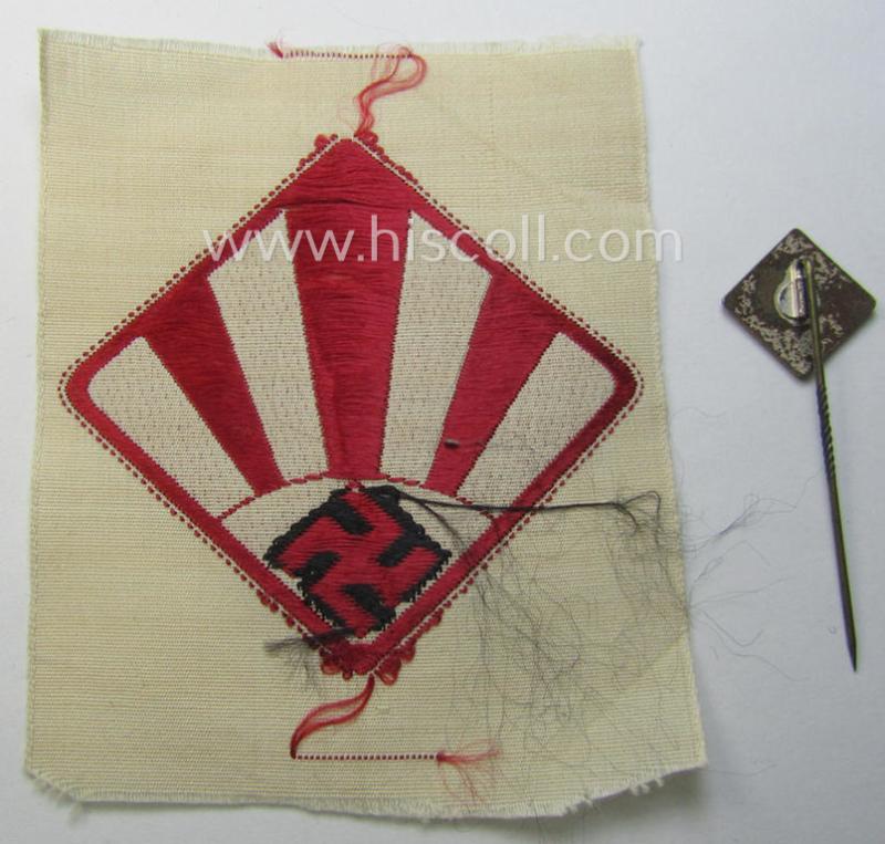 This is an attractive, two-pieced set comprising of a neat (multi-coloured) enamelled membership-lapel-pin (ie. 'Mitgliedabzeichen') and dito 'BeVo'-woven sports-attire-patch as both being specifically intended for a member who served within the: 'Reichsverband deutscher Turn-, Sport- und Gymnastiklehrer' (ie. sports'-coach- or: gymnastic trainers-association) both pieces coming in an overall nice- (albeit partly used- ie. worn-), condition. The neat lapel-pin shows some moderate usage- and wear (mainly dirt) but has no enamel damage whatsoever. The piece shows the black-coloured swastika (and is thus a somewhat later example of the 'second'-pattern). The pin - which comes mounted onto its functional pin ie. pin-set-up - is totally void of a makers'-designation. A similar example is also figured in the Heering-Hüsken lapel-pin-catalogue wherein such a the 2nd pattern-badge is given the unique reference-number (8766AB). The neat - and actually rarely found! - typically 'BeVo'-woven sports-attire patch measures 9,7 x 7,7 cms. and comes as 'straightly cut-of the role': it was never used and can easily be graded 'virtually mint unissued'. Simply a neat - and fairly uncommon! - lapel-pin/sports-attire-badge-set that was recently uncovered at a private-household. I deem that I have priced this neat 'Reichsverbandes deutscher Turn-, Sport- und Gymnastiklehrer'-grouping, accordingly!