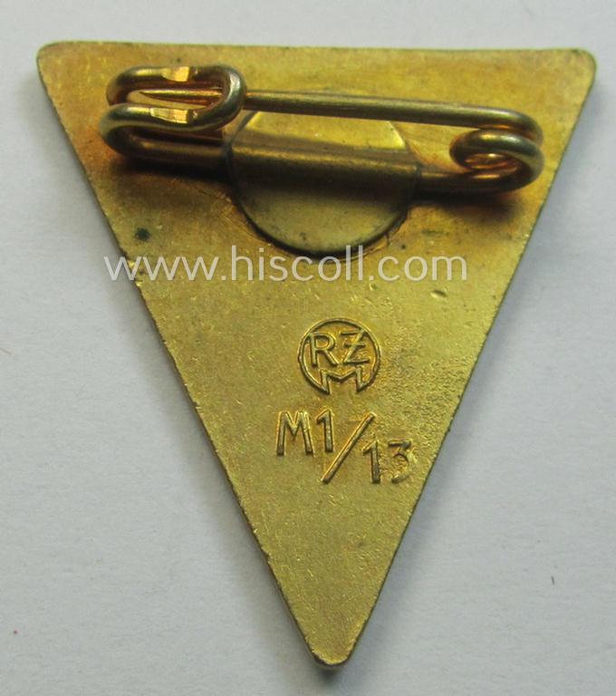 This particular - and just minimally used and/or neatly, multi-coloured enamelled! - TR-period membership-badge (ie. 'Mitgliedsabzeichen') was intended to signify membership within the German Womens'-Association (or: in German-language: 'NS-Frauenschaft'). The example on offer here is the medium-sized version of the series and measures approximately 2,7 cms. in height (as can be seen on the pictures). The badge comes in an overall very nice and only moderately used- ie. worn, condition: the enamelled surface is truly void of any enamel-damage and just shows some regular traces of usage and/or wear. The badge shows a clearly present: 'RzM M1/13'-makers'-designation on its back (as is more often seen as can be seen on the pictures). This example shows a functional pin- ie. pin-/catch set-up. An identical piece is also figured in the 'Heering-Hüsken' lapel-pin-catalogue wherein it is given a unique reference-number ('9125DA'). Simply an attractive - and actually not that commonly encountered! - enamelled 'NS-Frauenschaft-Mitgliedsabzeichen' that is I deem accordingly priced!