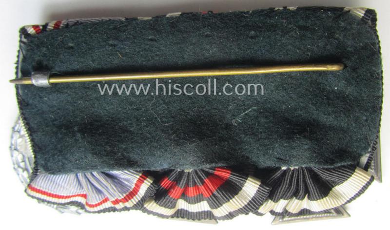 This is an attractive - and in this uncommonly found combination not that often seen! - three-pieced medal-bar (ie. 'Ordenspange') being of the 'non-detachable'-pattern that is respectively depicting a WWI-period: 'Eisernes Kreuz II. Klasse' (or: iron cross second class), a: 'Frontkämpferkreuz 1914-18' (ie.: 'Kriegsteilnehmerkreuz mit Schwertern') and a: 'Luftschutz-Ehrenzeichen 2. Stufe' (or: air-raid-warden service-medal second-class) being a 'regular-weight'-specimen as was executed in typical, greyish-toned- and zinc-based metal (ie. 'Feinzink') all three pieces coming in an overall nice- (albeit minimally used- ie. worn-), condition. All three awards are truly bronze- (ie. tarnished golden-) and/or greyish-silver-coloured that are just minimally tarnished by age and/or moderate usage and wear (as can be seen on the pictures) but are void of any damage or alike. The pieces come naturally mounted onto their period ribbons and have a nicely preserved age-patina and are just a tiny bit dirty: they were (I deem) never cleaned nor polished (as can be seen on the pictures). The entire 'Spange' is nicely 'backed' with a piece of darker-green-coloured wool and comes mounted onto a metal-based: 'backing-plate' that shows a (regular-type- and functional) pin- ie. catch-set-up (as can be seen on the pictures). The 'Frontkämpferkreuz 1914-18' is a clearly maker- (ie. 'G1'-) marked example. Simply an attractive example of a two-pieced WW1- ie. TR-related 'Ordenspange' in an uncommonly found combination that is (I deem) accordingly priced!