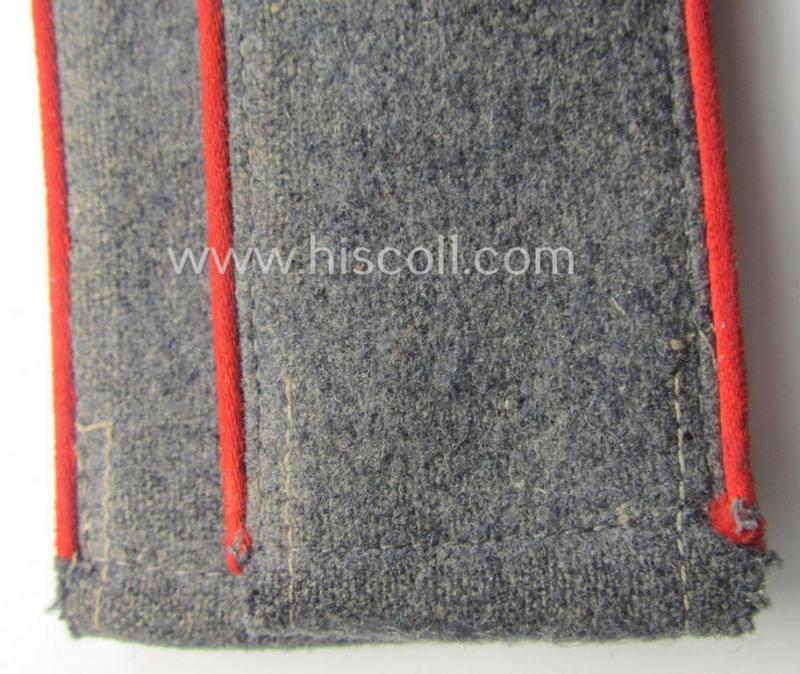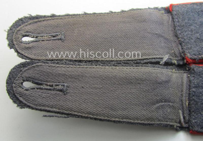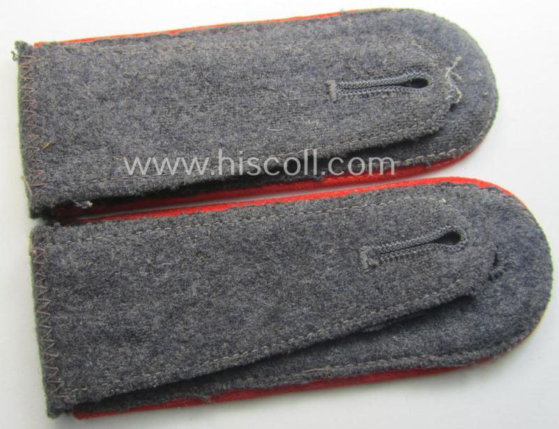 This is a neat - fully matching and just moderately used- and/or worn! - pair of WH (Luftwaffe), enlisted-mens'-type shoulderstraps as was piped in the bright-red- (ie. 'hochroter'-) coloured branchcolour as was specifically intended for usage by a: 'Soldat eines Flakartillerie-Regiments o. Abteilungs' (or: simple anti-aircraft soldier) and that comes in an overall nice- (ie. I deem just moderately used- ie. worn-), condition. The neat shoulderstraps - which measure approximately 12 cms. in length each and that come naturally mounted onto their functional tongues - are as stated piped in the neat bright-red- (ie. 'hochroter'-) branchcolour and have the desirable 'silk-like'-type piping attached (as can be seen on the pictures). The straps have the bluish-grey-coloured and/or 'smooth'-woolen-based 'upperdecks' and were with certainty intended as a: 'standard-issue'-type pair (as can be seen on the pictures). The straps show some minimal age ie. staining but are totally void of any damage or alike. Simply a great occasion to acquire a neat and just moderately used, enlisted-mens'-type LW-shoulderstrap-pair that was intended for a: 'Soldat eines Flakartillerie-Regiments o. Abteilungs'!