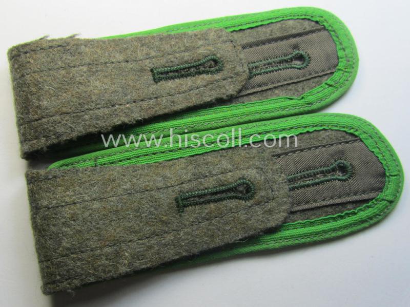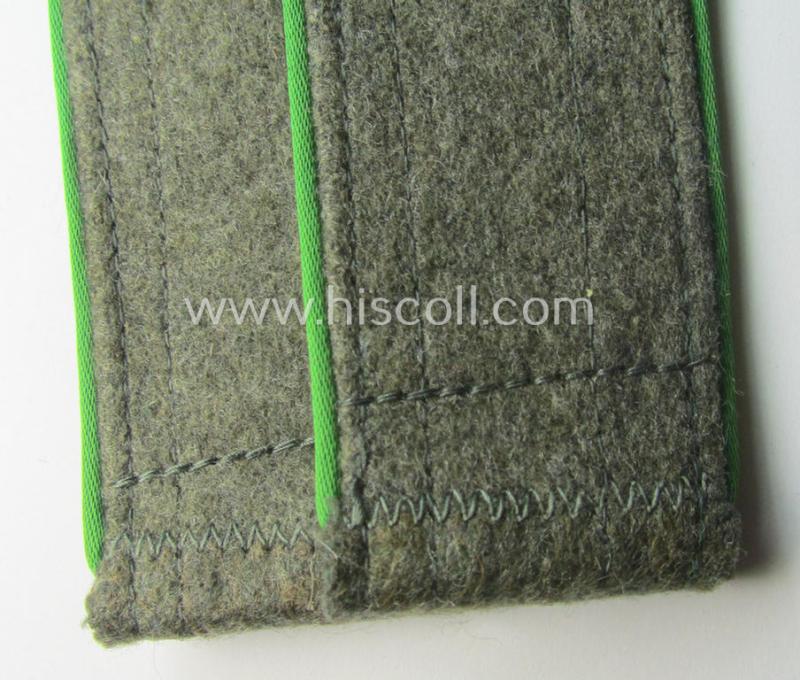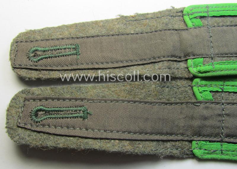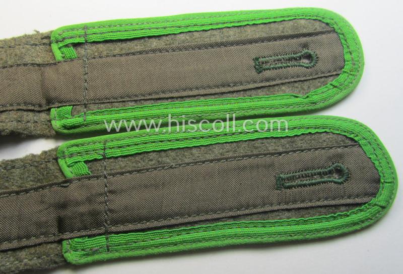 This is an attractive - fully matching and (I deem) just minimally or even never used - pair of typical, later-war-period, WH (Heeres) so-called: 'M44'-styled (ie. 'simplified') enlisted-mens'-type shoulderstraps as was piped in the neat bright-green- (ie. 'wiesen- o. hellgrüner'-) coloured branchcolour as was intended for a: 'Soldat eines Panzergrenadiere-Regiments' (or: simple soldier who served within a later-war-period, infantry-related so-called: rifle-regiment) and that comes in an overall very nice- (ie. I deem just minimally used- ie. worn-), condition. The straps - which are approximately 11 cms. sized in length each - have the 'standard-pattern'- and/or typical, field-grey- (ie. somewhat earthen-brown-) coloured and/or woolen-based 'upperdecks' and show the neat bright-green- (ie. 'wiesengrüner'-) coloured and/or: 'silk-like'-type branchcolour (ie. piping) attached. The straps are constructed following the typical '1944 cloth-minimising production-manner' using different shades of wool and/or material (as can be seen on the pictures). The straps show some minimal staining simply caused by minimal wear and/or decades of storage only. It should be noted that all 'M44'-style, EM-pattern shoulderstraps are actually quite hard to encounter and can easily be graded 'scarce': the ones as intended for the 'Panzergrenadier-Truppen' even more so! Simply a nice occasion to acquire an attractive - and fully 'text-book'! - M44-styled, enlisted-mens'-type shoulderstrap-pair as was intended for usage by a: 'Soldat eines Panzergrenadiere-Regiments': great to complete any later-war M44- (ie.even M43-) model 'Heeres'-tunic!