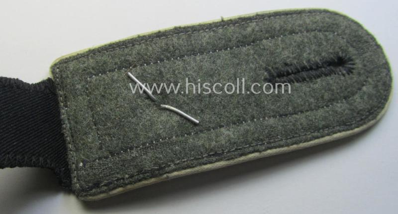 This is a very attractive - and I deem just moderately worn, albeit regrettably single! - (I deem) fairly early- (ie. mid-) war-period, Waffen-SS, NCO-type shoulderstrap that shows the neat white- (ie. 'weisser'-) coloured branchcolour and/or typical 'silk-like'-type piping attached and was as such worn by an SS-member (ie. NCO) holding the rank of an: 'SS-Oberscharführer der Infanterie-Truppen' (or: sergeant who served within the SS-infantry-troops). The strap - that shows the 'standard-issue'-pattern, silver-toned NCO-braid attached - is in all facets a fully 'text-book' and (I deem) early- (ie. mid-) war-period SS-strap and does show the moderate signs of having been used and/or worn as such. The shoulderstrap - that measures approx. 11 cms. sized in length as more often encountered - shows some moderate age and or staining simply caused by moderate wear and/or usage. The strap shows a (typical) smaller-shaped (SS-type) tongue attached (as observed on genuine, early-war-period Waffen-SS-pattern straps!) and does show a field-grey-coloured and/or woolen-based 'underlay': moreover, does it show a single (regular-sized and aluminium-based pip period-attached (as can be noticed on the pictures). It should be noted that these original, Waffen-SS, NCO-type shoulderstraps can nowadays easily be graded 'scarce': even more so when they are piped in the not that commonly encountered, white-coloured- (ie. 'SS-Infanterie-Truppen'-related-) branchcolour. I deem that this attractive and textbook Waffen-SS, NCO-type shoulderstrap is with certainty accordingly priced!