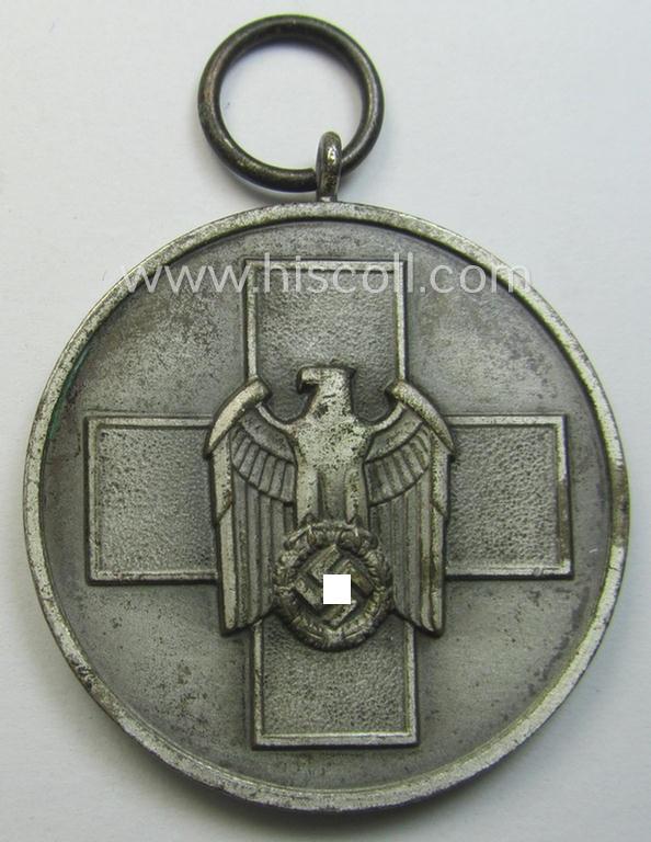 The attractive (bright)silver-toned and (I deem typical) zinc- (ie. 'Feinzink'-) based so-called: 'Deutsche Volkspflege'- (ie. civil-service-) medal came together with its (somewhat faded, minimally-confectioned- and 24 cms. long-sized) ribbon (ie. 'Bandabschnitt') as recently found. The award - that was surely once-mounted - is a very detailed and/or pronounced example: it has a truly very nice and only minimally 'tarnished' age-patina and was most certainly never cleaned nor polished (as can be seen on the pictures). The medal came together with its neat (ie. approximately 25 cms. long-sized!) piece of (somewhat pinkish-red-coloured- ie. minimally sun-faded) ribbon as issued and/or found. The award was recently found at a German private-household and was truly never before in collectors'-hands. Simply a very attractive 'Deutsche Volkspflege'-set that will be very hard to be upgraded and that is I deem accordingly priced!