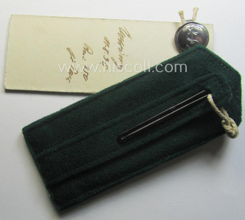This is an interesting - and possible unique! - single-pieced, TR-period (ie. 1936-dated) I deem 'Schutzenverein'-related (I deem) NCO-type shoulderstrap of the pointed-pattern being a so-called: 'Müsterstück o. Hausmuster' (ie. official example- or proof-specimen) as was produced by the company: 'Thiele & Steinert A.G. - Berlin' and that comes in an overall wonderful and naturally never used, condition. The piece - that is showing a darker-green-toned and (typical) NCO-pattern, woolen-based 'upperdeck' and that is showing the silver-toned (and green-striped) NCO-braid and that shows a chromed tunic-button period-attached - was apparently intended for a 'Schutzenverein' (ie. shooting-association) that was presumably based in the town of Osnabrück and that is dated: '11-6-1936' (something that can easily be deducted from the firmly-attached, carton-based 'tag'). The neat tag is firmly attached to the strap by means of a chrome-based 'seal' (that shows the clear makers'-designation 'TS - Berlin' as can be noticed on the pictures). Simpy a neat - and possible unique! - single-pieced, TR-period, 'Müsterstück o. Hausmuster'-piece that provides a nice insight into the German craft of insignia-production in the years!