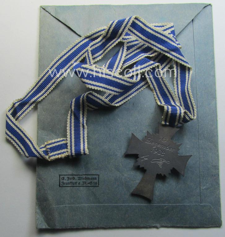 'Ehrenkreuz der deutschen Mutter - zweite Stufe' (or: silver-class mothers'-cross) that came mounted onto its long-sized ribbon and that came stored in its period pouch by the maker: 'E. Ferd. Wiedmann - Frankfurt a. M.'