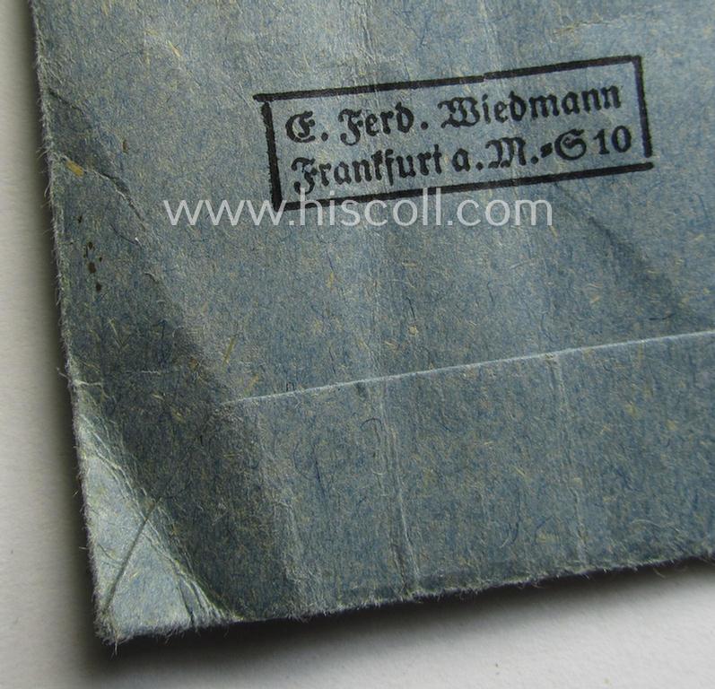 This is an attractive - and fully complete! - example of an: 'Ehrenkreuz der deutschen Mutter - zweite Stufe' (or: silver-class mothers'-cross) being a virtually 'mint' albeit certainly issued - example that came together with its accompanying (long- ie. full-sized- and just minimally confectioned!) ribbon (ie. 'Bandabschnitt') and that came packed in its period- (ie. typical blue-coloured- and/or 'Zellstoff'-based) pouch by the (unusually seen!) maker: (ie. 'Hersteller') named: 'E. Ferd. Wiedmann - Frankfurt a. M. - S 10' and that comes as issued and/or recently found. The award has truly no enamel damage whatsoever and comes in a very attractive and/or totally uncleaned, condition. The very bright (ie. minimally tarnished) silver-coloured finish is simply excellent without showing any defaults. The ribbon (which is actually not that easily encountered) came in a minimally-confectioned- and/or full-length condition (as can be seen on the pictures). The pouch comes in an equally nicely preserved (and fully untouched and complete) condition: it is just a bit wrinkled ie folded. Simply a great, silver-class 'MK-set' without any real defaults: almost impossible to upgrade this attractive, silver-class MK-set!