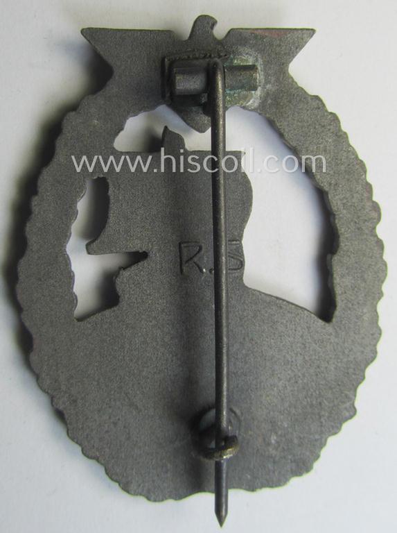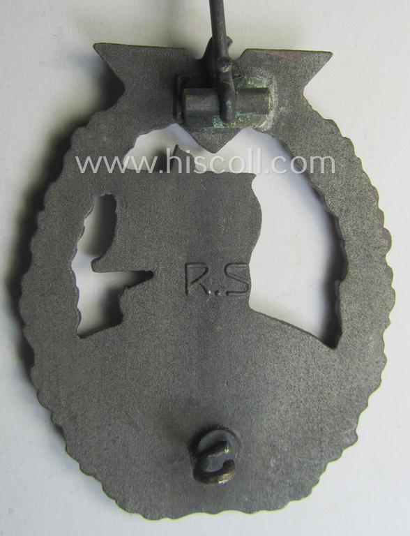 WH (KM) 'Hilfskreuzer-Kriegsabzeichen' (or: auxiliary-cruiser war-badge) being a typical, maker- (ie. 'R.S.'-) marked- and/or: 'Feinzink'-based example as was produced by the: 'Rudolf Souval'-company