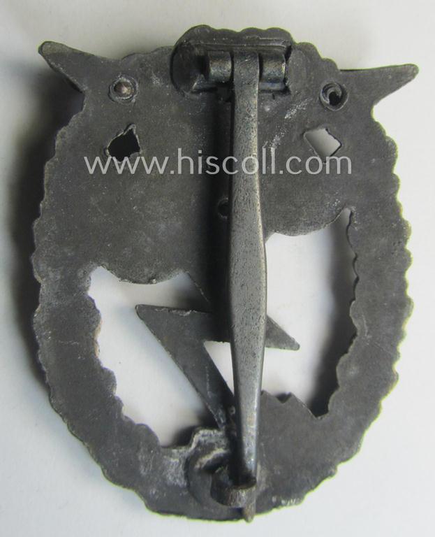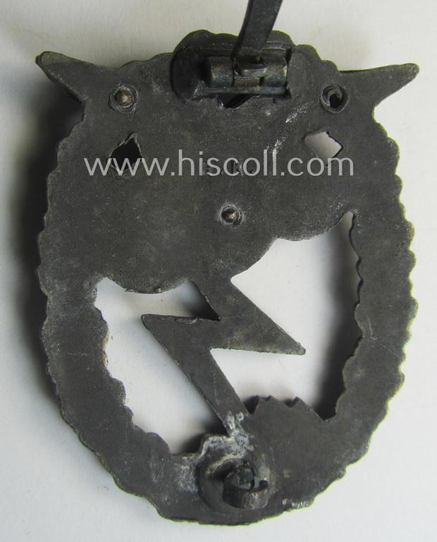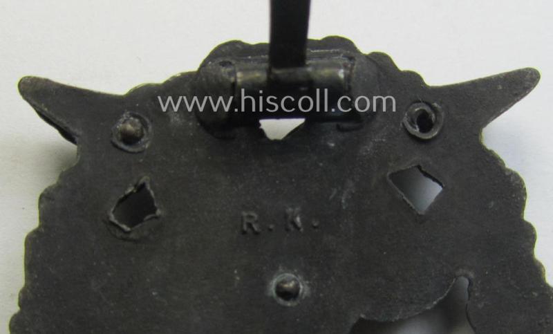 This is a truly attractive - and I deem mid- (ie. later-) war-period produced and actually scarcely encountered! - typical zinc- (ie. 'Feinzink'-) based specimen of a WH (Luftwaffe) 'Erdkampfabzeichen' (or: air-force, ground-combat war-badge) being a fairly luxuriously-styled and clearly maker- (ie. 'R.K'.-) marked that shows a typical 'triple-riveted' eagle-device originally- (and firmly!) attached and that comes in an overall very nice- (albeit moderately used ie. worn-), condition. The neat - and truly very detailed! - LW-war-badge - which as stated above has I deem just been moderately used and/or worn worn - is minimally vaulted and comes naturally mounted onto its functional (typical flute-shaped- and wide-sized) pin- and/or functional (and fully unaltered!) catch (ie. typical catch-set-up) in place. These mid- (ie. later-war-) period badges show a 'loose' and/or detailed silver-grey-coloured eagle-device attached (by means of three copper-toned rivets as is visible on the back). These zinc-based badges show, however, nice and/or pronounced detail overall. The badge truly retains most of its period finish but does show a minimally tarnished age-patina as is more often encountered. The badge shows a clear makers'-designation: 'R.K.' on its back and can as such be attributed to the company: 'Rudolf Karneth' ('R.K.') as was based in the town of Gablonz: various specific details corroborate this. The piece - which can easily be graded 'fairly scarce' - retains all its pristine and fully unaltered rivets in place and is still somewhat stained ie. dirty but has - I deem - never been cleaned (as can be seen on the pictures). Simply a very nice - and garuanteed original! - zinc- (ie. 'Feinzink'-) based specimen of this desirable LW-war-badge that is in my opinion accordingly priced!