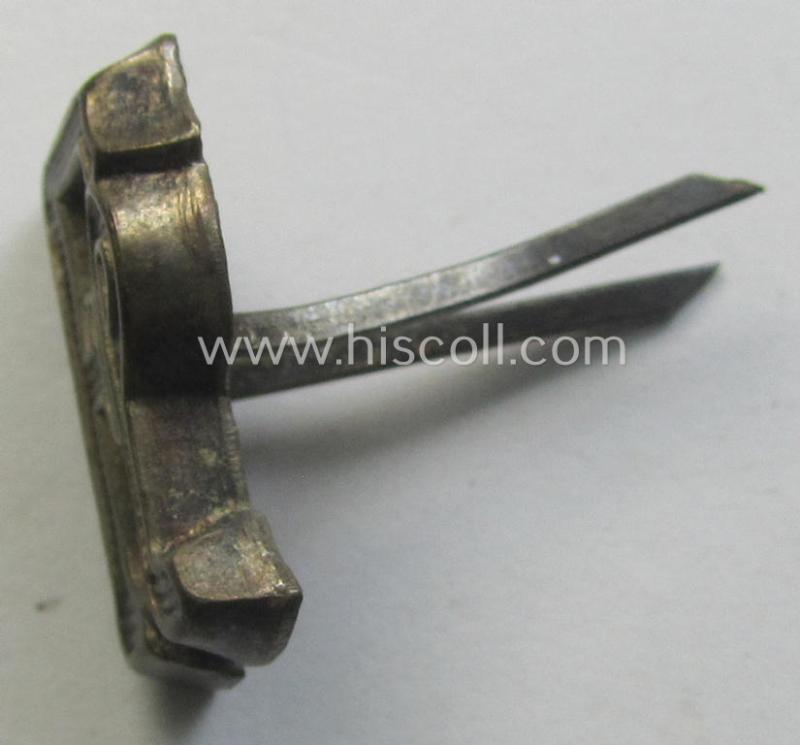 This is an attractive - regrettably single and merely Waffen-SS-related and with certainty rarely encountered! - NCO-type- (thus silver-coloured- and typical 'Buntmetall'-based) so-called: Waffen-SS-related: 'Fl'-shoulderstrap-'cypher' (ie. 'Ziffer') as was specifically intended for usage by an: 'SS-Unterführer der Fla.MG-Abteilungen' (or: NCO who served within a specific SS-machine-gunners, anti-aircraft unit) and that comes in an overall very nice- (ie. I deem simply never worn nor even strap-attached-), condition. The cyper - which is per regulation executed in the Roman-styled letter-type - is in all facets a 'text-book' example and comes mounted onto both its still functional (ie. never bent- ie. pristine!) prongs, attached. The piece does show some minimal age ie. tarnish simply caused by decades of storage only. It should be noted that these (merely for the) 'Waffen-SS' intended shoulderstrap-cyphers (ie. 'Ziffern') can easily be graded 'very rare'. Only the third such neat and rare specimen I ever had on offer!