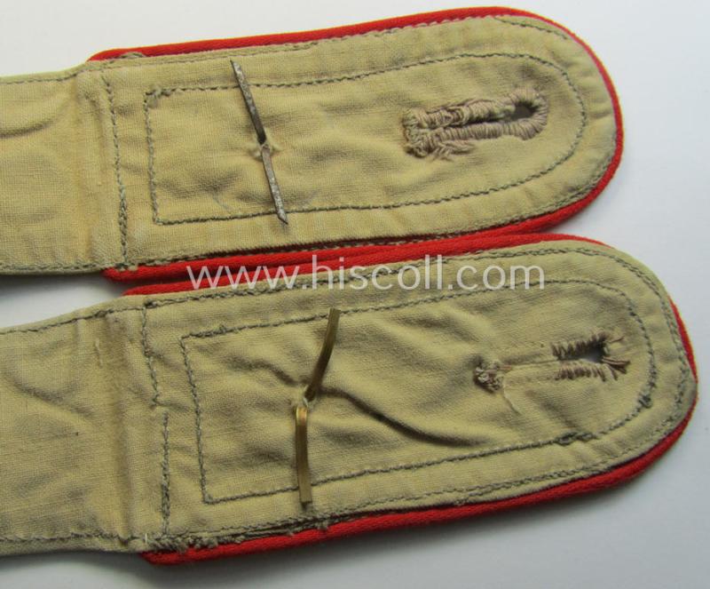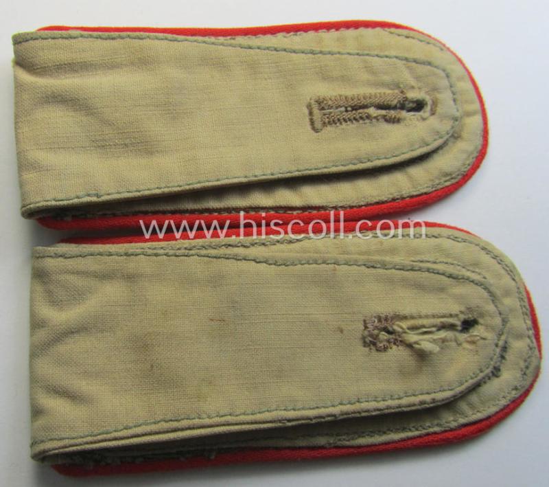 This an attractive pair of - truly used- and/or worn! - WH (Luftwaffe) 'tropical-styled' NCO-type shoulderstraps which are both approximately 10,5 cms. sized in length and that come in an overall nice- (albeit somewhat (sun)faded- ie. stained condition): both pieces show the neat bright-red- (ie. 'hochroter'-) coloured branchcolour (ie. 'silk-like'-type piping!) attached and were as such intended for usage by a sergeant who served within the Luftwaffe anti-aircraft-troops (ie. 'Flak-Artillerie-Truppen'). The attractive straps - which are both executed in the regular - albeit slightly 'thicker'-styled- and/or: somewhat more smooth-like linnen - come naturally mounted onto their functional tongues. Both pieces have the typical (bluish-grey-coloured- ie. typical Luftwaffe-styled, dotted- ie. sub-dued-pattern) NCO-braid and a pair of (regular-sized and aluminium-based) pips period-attached as to be expected (as can be seen on the pictures). The pair shows some obvious wear and/or staining as can be noticed on the pictures (but is, nevertheless, fully undamaged). Of additional interest is naturally the fact that this pair is matching in all facets: something that is most certainly not always the case with these WH (Luftwaffe) 'tropical-styled' NCO-type shoulderstraps. It should be noted that these LW tropical-styled, NCO-type shoulderstraps can easily be considered 'very scarce': even more so when they come in such a neat and/or fully untouched, condition: I deem that I priced this neat pair, accordingly!