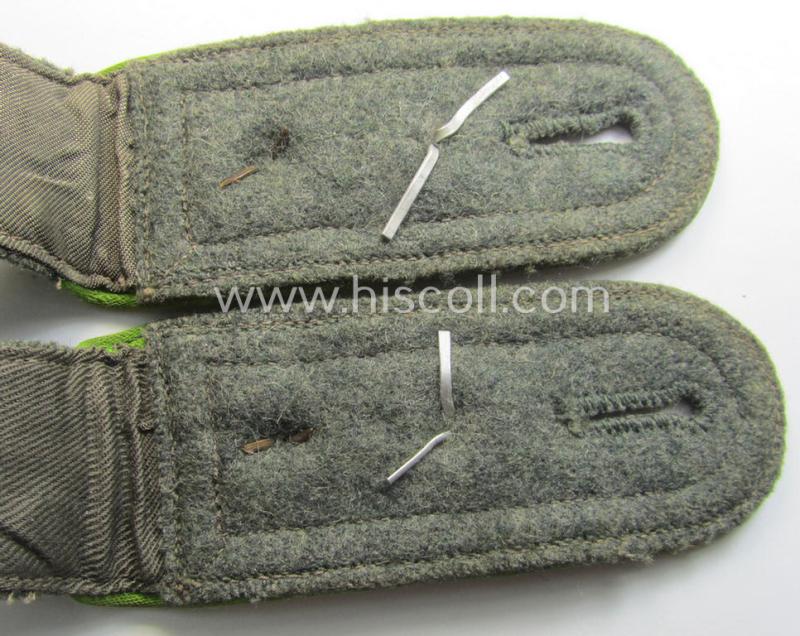 This is a truly very attractive - and as such actually very scarcely encountered! - fully matching pair of (typical) early- (ie. mid-war-period- or: 'M41 o. M43'-pattern) WH (Heeres) NCO-type shoulderstraps as piped in the neat bright-green- (ie. 'hellgrüner'-) coloured branchcolour as was specifically intended for usage by an: 'Oberfeldwebel eines Panzergrenadier-Regiments. o. Abteilungs' (or: NCO ie. sergeant first-class who served within an army infantry-related rifle-unit ie. regiment) and that comes in an overall very nice- (I deem issued albeit just minimally used- ie. worn-), condition. The neat shoulderstraps - which each measure approximately 10,7 cms. in length as more often - have the 'standard-pattern'- and/or typical, field-grey-coloured and/or woolen-based 'upperdecks' and come naturally mounted onto their original tongues (as can be seen on the pictures). The pair was just minimally worn and comes as found and/or stored for decades. The shoulderstraps - which show the neat and desirable, bright-green- (ie. 'hellgrüner'-) coloured and/or typical 'silk-like'-type piping attached - show the bluish-grey-coloured (ie. typically 'sub-dued') NCO-braid and two pairs of (fully matching and aluminium-based) pips period-attached denoting that the NCO who wore these straps held the rank of an: 'Oberfeldwebel'. Simply a very attractive - and verydesirable! - pair of mid-war-period so-called: 'M41 o. M43'-pattern-shoulderstraps as was intended for - and clearly worn by! - an: 'Oberfeldwebel eines Panzergrenadier-Regiments. o. Abteilungs': with certainty one of the most attractive 'Panzer-Grenadiere'-related NCO-shoulderstrap-pairs I had on offer for quite some time!