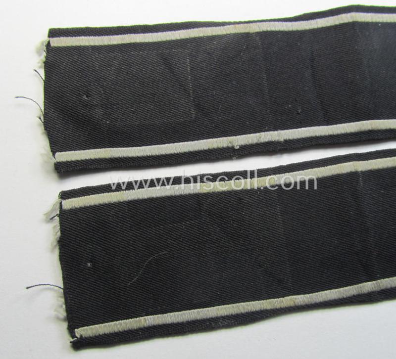 This is a very attractive - and actually scarcely encountered! - example of a so-called: cuff-title (ie. 'Ärmelstreifen') entitled: 'Technische Nothilfe' (= 'TeNo'), being an example as woven in the neat 'BeVo'-weave pattern and that comes in an overall very nice (ie. I deem hardly used- ie. still 'virtually mint'-), condition. The cuff-title - which is I deem a typical enlisted-mens' ie. NCO-type specimen - is executed in greyish-blue-coloured linnen as interwoven onto a black-coloured (and also linnen-based) background. The piece comes in a full-length condition and measures approximately 44 cms. in length (and having a width of 4 cms.). As usually encountered are both ends 'unfinished' and do show some minor fraying as to be expected. The armband does show some minimal staining simply caused by decades of storage and/or possible wear. Simply and attractive - and naturally genuine! - 'TeNo'-cuff-title that will be hard to be upgraded!