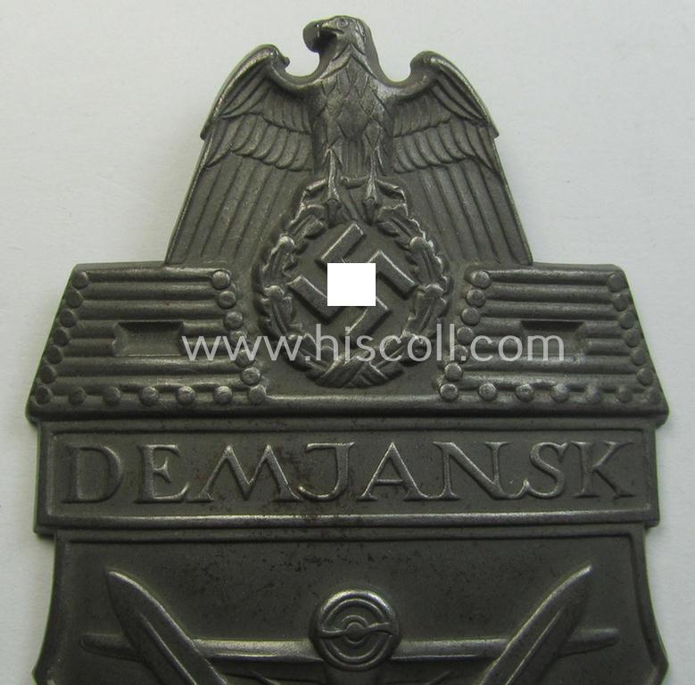 'Virtually mint' - albeit regrettably incomplete - example of a WH (Heeres ie. Waffen-SS) 'Demjansk'-campaign-shield as executed in typical magnetic, so-called: 'Eisenblech'