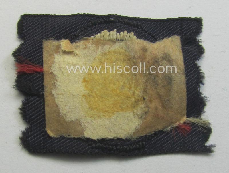 This is an attractive - and nowadays truly very scarcely encountered! - WH (Heeres ie. 'Panzer'-related) 'standard-issue'-pattern side-cap-cocarde (ie. 'Kokarde für Panzer-Schiffchen o. Einheitsfeldmütze') being an example as executed in so-called: 'BeVo'-weave pattern and that comes in an overall very nice- (ie. simply never used- ie. 'virtually mint'-), condition. The piece was I deem once glued into an album or scrapbook and does show some minimal carton- ie. glue-remains on its back (as can be noticed on the pictures). It should be noted that these side-cap- (ie. 'Schiffchen'-) insignia-pieces are quite difficult to encounter (and come hardly ever for sale). The piece - which is executed in the so-called: 'BeVo'-weave pattern and is executed in multi-coloured linnen onto a black-coloured- and/or also linnen-based background: it was simply never used and comes as 'straightly cut-of the role' (as can be seen on the pictures). The piece shows some minimal storage-age only but can, nevertheless, excellently be used to complete or restore any black-coloured side-cap (ie. 'Panzer-Schiffchen'). Simply an attractive 'Heeres Panzer'-related side-cap insignia-piece that is actually hard to encounter and that is I deem accordingly priced!