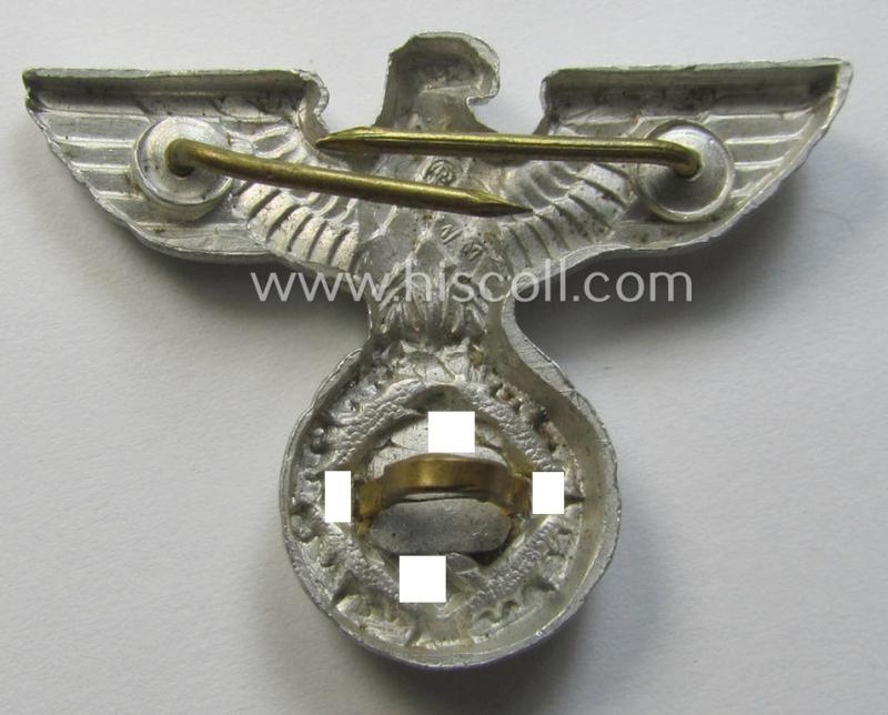 Smaller-sized, bright silverish-grey-coloured- and typical aluminium-based (political-style) visor- (ie. 'Schirmmützen'-) cap-eagle being a detailed example that is neatly: 'RzM - M1/17'-marked on its back