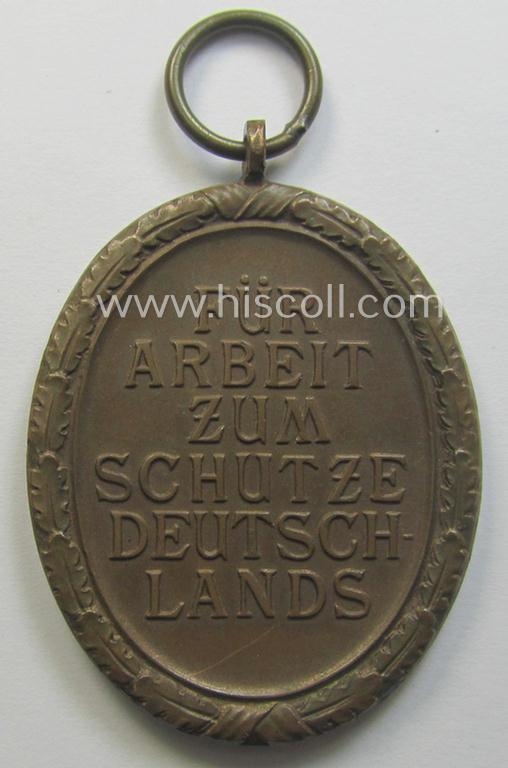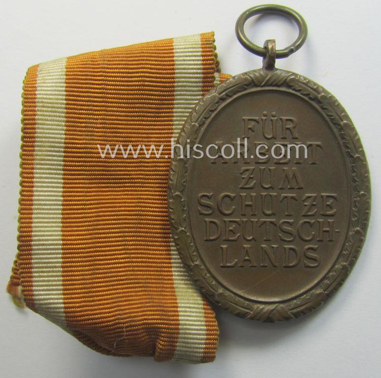 This is an attractive medal-set: 'Deutsches Schutzwall Ehrenzeichen' (aka: 'Westwall'-medal) being a non-maker-marked- and/or 'Buntmetall'-based specimen that came together with its period- (and neatly folded- ie. minimally-confectioned) ribbon (ie. 'Bandabschnitt') as recently found. The neat medal came together with its original, confectioned- (and approx. 19 cms. long-sized- and/or typical mustard-brown-coloured) ribbon as issued and/or stored for decades. The medal - which is a neat 'Buntmetall'-based specimen - has an attractive (albeit minimally darkened) bronze-coloured age-patina (simply caused by decades of storage) and was most certainly never cleaned nor polished and therefore are details and/or finish still very nice and/or crisp. Simply an attractive - and I deem fairly early-war-period! - 'Deutsches Schutzwall Ehrenzeichen' (aka: 'Westwall'-medal)-set that is accordingly priced!