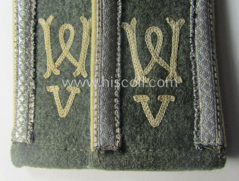 This is a very attractive - fully matching and with certainty very scarcely found! - pair of (fairly early- ie. rounded-styled), neatly 'cyphered' WH (Heeres) NCO-type (ie. 'M40'-pattern) shoulderstraps as piped in the white- (ie. 'weisser'-) coloured branchcolour as was specifically intended for - and moderately used by! - a junior-NCO (ie. 'Unteroffizier') who served within the: 'Wehr-Ersatzdienstelle im Wehrkreises V' (or: army-NCO ie. junior-sergeant who was part of the recruitment-troops serving within the area of the 'Wehrkreis V' (being a larger area of which its HQ was residing in the town of Stuttgart) and that comes in an overall very nice- (albeit minimally used ie. worn- and/or most certainly once tunic-attached-), condition. The straps are just moderately worn and do show some minimal wear, age and/or staining but are void of any damage or alike (as can be seen on the pictures). The straps show the desirable white- (ie. 'weisser'-) coloured- and/or woolen-type piping attached and measure approximately 11,7 cms. in length each. The pieces came mounted onto their period tongues attached and show the (larger-sized, Gothic-styled) so-called: 'W'-cyphers (ie. 'Ziffern') and smaller-sized (Roman-styled) 'V'-numerals (ie. 'Ziffern') which are neatly machine-embroidered by means of so-called: 'Kurbelstickerei' (as can be seen on the pictures). All four 'cyphers' are executed in the the white- (ie. 'weisser'-) coloured wool ie. linnen as to be expected. The pair - that also shows the silverish-toned NCO-braid attached - is constructed from the typical field-grey-coloured wool and is with certainty a 'standard-issued'-pair. These type of shoulderstraps are of the fairly early-war-period-pattern straps and were worn in the period around 1940 (and were 'worn-out' even during the rest of the war). This particular pair originated from a larger cloth- ie. 'cyphered'-shoulderstrap-collection I recently acquired for the web-site. Simply a very attractive - and with certainty very desirable! - 'cyphered', 'Wehrkreis'-related NCO-type shoulderstrap-pair that belonged to an: 'Unteroffizier des Wehr-Ersatzdienstelle im Wehrkreises V'. I deem that I have priced this truly attractive NCO-type pair according to its desirabilty and overall very nicely preserved condition!