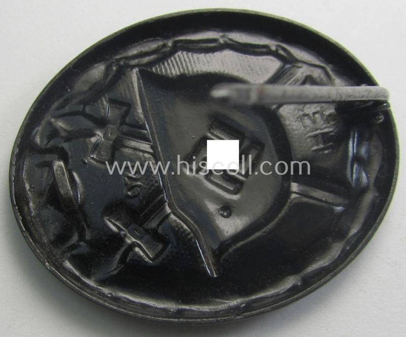 The attractive - and I deem hardly used- nor worn - black-class wound-badge (ie. 'Verwundeten-Abzeichen in Schwarz') truly retains almost all of its original, black-coloured- and/or somewhat 'shiny'- (ie. glossy-like-) finish: it only shows minimal wear and was simply nicely preserved over the years. The (magnetic) wound-badge is - as stated above - neatly maker-marked with the (dual!) makers'-designation that reads: 'E.H.'- and/or '126' (as is clearly visible on the back of the badge as can be seen on the pictures) signifying that it deals with a piece that was produced by the desirable 'Eduard Hahn'-company as was based in the town of Idar-Oberstein a.d. Nähe. Of course, are the (regular- ie. thin-shaped- and/or non-magnetic) pin and/or: (typical) catch (-set-up) fully functional and of course present. This piece has never been cleaned nor polished: it shows some minimal dust and/or minimal staining as to be expected.