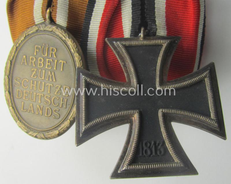 This is a truly attractive - and in this combination with certainty not that easily found! - two-pieced (WWII- ie. TR-period) medal-bar (ie. 'Orden- o. Doppelspange') that respectively shows an: 'Eisernes Kreuz II. Klasse' (or: iron-cross second class) and a: 'Deutsches Schutzwall Ehrenzeichen' (aka: 'Westwall'-medal), both awards coming in an overall very nice- (albeit just minimally used and/or worn-), condition. Both medals are very nicely preserved examples that seem to have never been cleaned nor polished: both come in an equally minimally tarnished- ie. dusty condition and naturally also come mounted onto their period ribbons. The iron cross - which is an attractive example that was produced by a by me unidentified the maker (ie. 'Hersteller') - was with certainty never cleaned and has a very nice and/or attractive age-patina: it has just a minimally tarnished appearance (as can be seen on the pictures). The cross retains truly very nice and/or pronounced detail and has a very nicely preserved, black-finished (ie. somewhat 'matted'- ie. satin-like) core: it is totally void of any paint-damage or alike. The 'Westwall'-medal is a neat Buntmetall-based example that retains also all of its original, golden-bronze-toned finish: it is also a tiny bit dirty ie. tarnished, simply caused by minimal wear and/or decades of storage (as can be noticed on the pictures). The 'Ordenspange' comes naturally mounted onto its functional pin- (ie. catch-) set-up and is neatly 'backed' with a piece of bright-red-colored wool and comes mounted onto a metal-based 'backing-plate' as is more often seen (as can be seen on the pictures). Of additional interest is, moreover, that fact that this medal-bar came with its accompanying, two-pieced 'Feld- o. Bandspange' as issued and/or stored for decades. The medal-bar-set was recently found at a private-household in Germany and was never before part of a collection. The 'Spange' is most certainly a period-compiled- and/or worn piece and is NOT a post-war compilation or alike: it originated as stated above from a private-household and was kept as such for decades. Simply a very attractive - and decorative! - two-pieced, WH (Heeres o. Kriegsmarine etc.) related medal-bar- ie. 'Orden- o. Doppelspange' that is in my opinion accordingly priced!