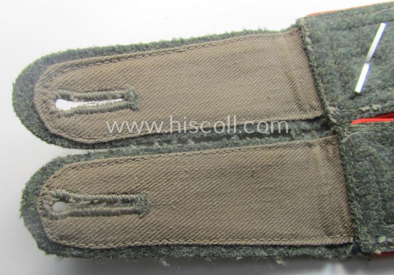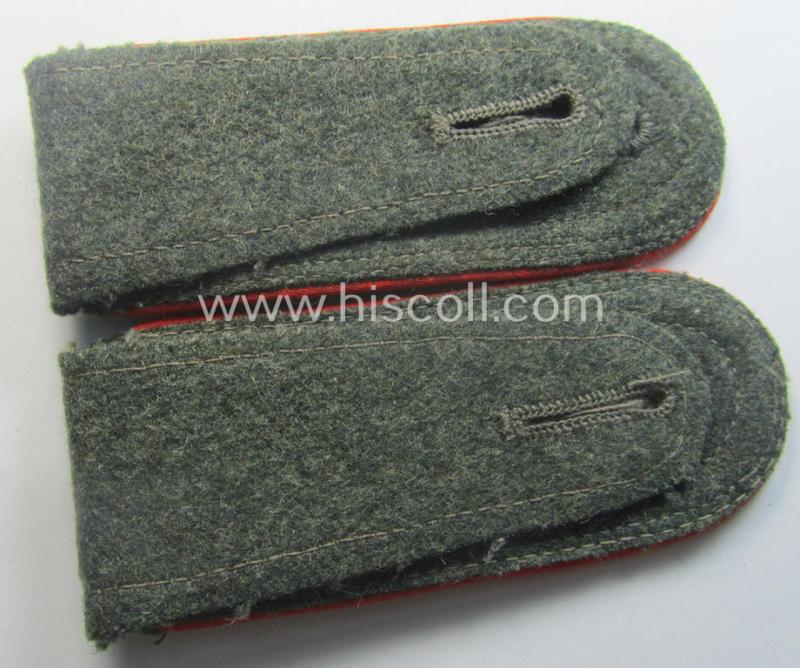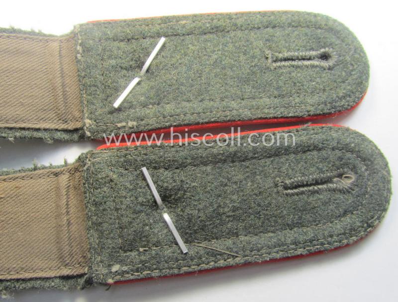 This is a truly very attractive - and just minimally used and/or fully matching! - pair of typical 'standard-issued'- (ie. non-'tailor-made'-) pattern, WH (Heeres) early- (ie. mid-) war period- (ie. 'M41'- ie. 'M43'-pattern) NCO-type shoulderstraps (ie. 'Schulterklappen für Unteroffiziere des Heeres') as was piped in the desirable bright-red- (ie. 'hochroter'-) coloured branchcolour as was specifically intended for usage by a: 'Wachtmeister o. Feldwebel eines (Sturm)Artillerie-Abteilungs o. Regiments' (or: sergeant who served within an artillery unit or regiment) and that comes in an overall very nice- (ie. I deem just moderately used- ie. worn-), condition. The neat straps - which have the 'standard'-pattern, field-grey-coloured and/or typical woolen-based 'upperdecks' and that measure approximately 11,2 cms. in length each - show the neat bright-red- (ie. 'hochroter'-) coloured and/or desirable 'silk-like'-type piping attached (as can be seen on the pictures). The straps - that show the typical bluish-grey-toned (ie. truly sub-dued) NCO-braid and a pair of (regular-sized, aluminium-based) pips period-attached - come naturally mounted onto their period (regular-shaped) tongues attached and come both in a very nice- (ie. fully 'text-book') condition overall (as can be seen on the pictures). The pair only shows minimal wear and/or age and is just very nicely preserved (as can be seen on the pictures). I deem this an excellent occasion to acquire a neat NCO-type, non-privately-purchased '(Sturm)Artillerie'-related shoulderstrap-pair for a justified price!