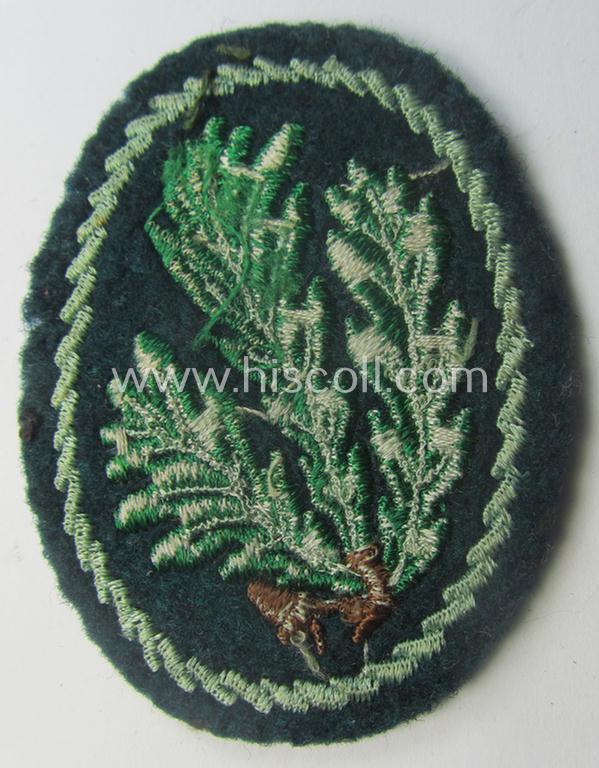 Truly used WH (Heeres) so-called: 'Jäger'-armbadge being a neatly machine-embroidered- and/or multi-coloured version as was executed on darker-green-coloured 'felt-based'-wool