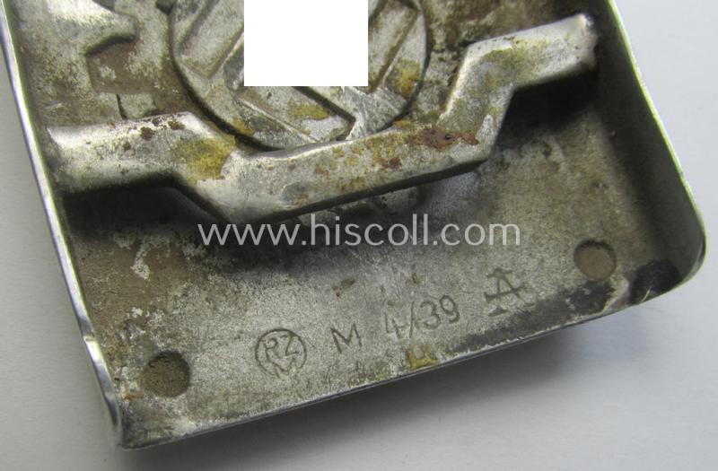 The attractive - and as always aluminium-based- belt-buckle retains most of its (somewhat shiny) greyish-silver-toned finish and comes in a moderately used- and/or worn, condition: it does show some age ie. staining simply caused by moderate usage and decades of storage and/or handling over the years but was - I deem - not recently cleaned nor polished. The buckle - that comes mounted onto its typical 'cranked'-catch - is nicely (and clearly!) maker-marked with a makers'-designation (ie. 'A'- or: 'Assmann u. Sohne'-logo) and bears additionally an: 'RzM M4/39'-marking (which markings are both visible on the back of the buckle as can be seen on the pictures). The buckle - which truly retains pronounced detail - orginates from an older belt-buckle-collection that was compiled over many years and that I acquired for the web-site. Simply an attractive - and truly worn- and used! - 'DAF' (ie. 'Deutsches Arbeitsfront') ie. 'Werkschar'-related belt-buckle that is accordingly priced!
