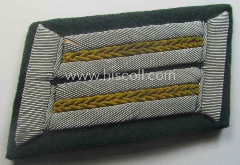 This is a neat - and fully matching! - pair of WH (Heeres) officers'-type, hand-embroidered collar-tabs (ie. 'Kragenspiegel für Offiziere') as was piped in the typical golden-yellow- (ie. 'goldgelbener') coloured branchcolour as was intended for usage by an: 'Offizier der Kavallerie o. Aufklärungs-Truppen' (or: officer who served within a cavalry- or reconnaisance unit ie. regiment) and that comes in an overall very nice- (ie. I deem issued- and/or minimally used- ie. carefully tunic-removed-), condition. The pair - which is showing an additional 'backing' of typical 'buckram' as is more often (as can be seen on the pictures) - shows extraordinary hand-embroidery and just shows some minimal age ie. staining (and minimal wear) as can be noticed on the pictures. It should be mentioned that these golden-yellow-piped, 'Heeres'-type, 'Kragenspiegel der Kavallerie o. Aufklärungs-Truppen' are actually quite hard to come by and can easily be graded 'fairly scarce'.