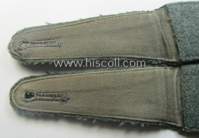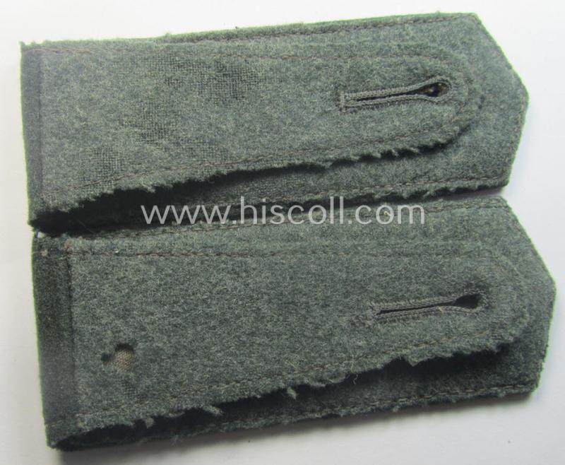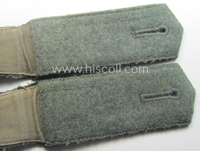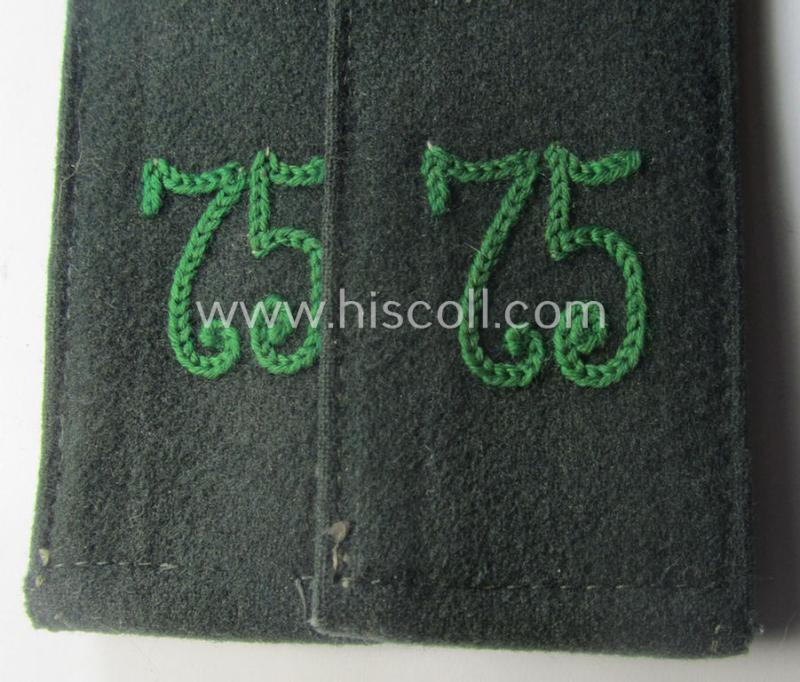 This is a very attractive - fully matching and actually truly very scarcely found! - pair of WH (Heeres) early-war-period, so-called: 'M36-/M40'-pattern- (pointed-styled) 'cyphered', enlisted-mens'-type (and as per regulation, non-piped!) shoulderstraps as was intended for - and clearly worn by! - a: 'Soldat des Jäger-Regiments 75' (or: simple soldier who served within the army mountain-troops regiment, numbered: '75') and that comes in an overall very nice- (albeit moderately used ie. clearly worn-), condition. The shoulderstraps - which are approximately 11,5 cms. sized in length - have the 'standard-type'- and/or darker-green-coloured, smooth-woolen-based 'upperdecks' and show the neat (machine-embroidered by means of so-called: 'Kurbelstickerei') so-called: '7'- and/or: '5'-cyphers ie. numerals (or: 'Ziffern'). Both 'cyphers' are executed in the darker-green- (ie. 'grüner'-) coloured wool ie. linnen as to be expected (as can be seen on the pictures). The straps - which came mounted onto their functional tongues - show as stated above some moderate usage and/or wear (some minor staining and/or dust is visible and/or present). I deem, moreover, that this pair was once used by an NCO ie. 'Unteroffizier': the silverish-toned NCO-braid was very carefully removed for or unclear reasons leaving almost no traces (as can be noticed on the pictures). It should be noted that all 'cyphered'-pattern, WH (Heeres) shoulderstraps can easily be regarded 'fairly scarce'. This shoulderstrap-pair originates from an older shoulderstrap ie. board-collection that I recently acquired for the web-site. Simply an attractive and/or: early-war-period, neatly 'cyphered' and/or 'Heeres'-related EM-type shoulderstrap-pair that was intended for usage by a: 'Soldat des Jäger-Regiments 75'!