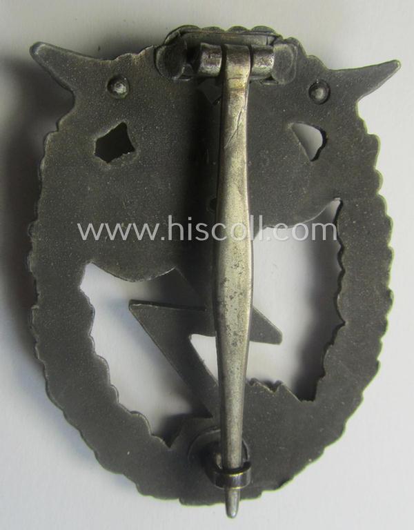 This is a truly attractive - and I deem mid- (ie. somewhat later-) war-period produced and actually scarcely encountered! - typical zinc- (ie. 'Feinzink'-) based specimen of a WH (Luftwaffe) 'Erdkampfabzeichen' (or: air-force, ground-combat war-badge) being a fairly luxuriously-styled and clearly maker- (ie. 'M.K 5'.-) marked that shows a typical 'double-riveted' eagle-device originally- (and firmly!) attached and that comes in an overall very nice- (albeit moderately used ie. worn-), condition. The neat - and truly very detailed! - LW-war-badge - which as stated above has I deem just been moderately used and/or worn worn - is non-vaulted and comes naturally mounted onto its functional (silverish-coloured, typical flute-shaped- and wide-sized) pin- and/or functional (and fully unaltered!) catch (ie. typical catch-set-up) in place. These mid- (ie. later-war-) period badges show a 'loose' and/or detailed silver-grey-coloured eagle-device attached (by means of two rivets as is visible on the back). These zinc-based badges show, however, nice and/or pronounced detail overall. The badge truly retains most of its period finish but does show a minimally tarnished age-patina as is more often encountered. The badge shows a clear makers'-designation: 'M.K. 5' on its back and can as such be attributed to the company: 'Metall- u. Kunststoff' as was based in the town of Gablonz: various specific details corroborate this. The piece - which can easily be graded 'fairly scarce' - retains all its pristine and fully unaltered rivets in place and is still somewhat stained ie. dirty but has - I deem - never been cleaned (as can be seen on the pictures). Simply a very nice - and garuanteed original! - zinc- (ie. 'Feinzink'-) based specimen of this desirable LW-war-badge that is in my opinion accordingly priced!