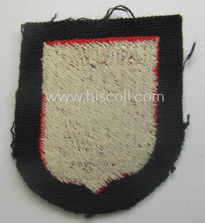 Latvian, Waffen-SS 'volunteer' arm-shield as was specifically intended for usage by soldiers of the: '15. o. 19. Waffen-Grenadier-Division der SS' (ie. 'lettische nr. 1 o. 2') that comes in a 'virtually mint- ie. unissued', condition