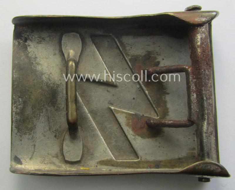 The attractive - and actually nowadays not that easily found! - youth-related belt-buckle (ie. 'Koppelschloss') is of the neat (and desirable!) 'variant'-pattern (having a 'slim-lined' Rune-device attached!) is clearly used and/or worn and has lost a fair bit of its shiny, silverish- and/or typical 'nickle-chromed'-finish (it has, however, - I deem - never been cleaned nor polished and only shows some dust and/or staining as to be expected). This specimen is totally void of a makers'-designation (something that is more often but most certainly not always encountered!). The buckle shows a copper-toned- (and typical early-period) slime-shaped, so-called: 'DJ-Rune'-sign attached (as can be seen on the pictures). The piece orginates from an older belt-buckle-collection that was compiled over many years and that I acquired for the web-site. I deem that I have priced this neat, 'variant'-pattern youth-related belt-buckle according to its untouched albeit clearly used and/or worn, condition!