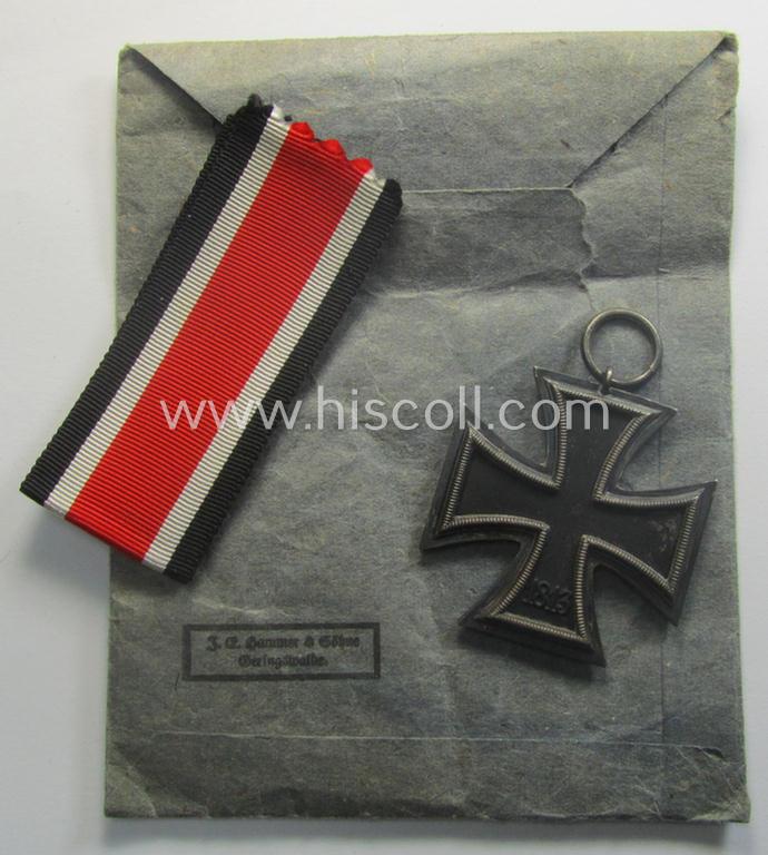 'Eisernes Kreuz 2. Kl.' being a maker- (ie. '55'-) marked example that comes stored in its period 'Zellstoff'-based pouch by the: 'J.E. Hammer & Söhne'-company as was based in the town of Geringswalde