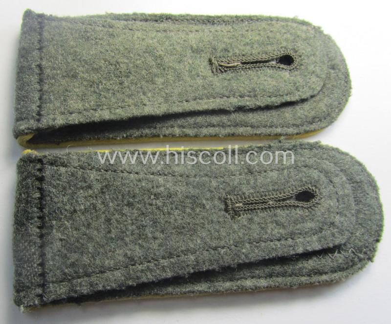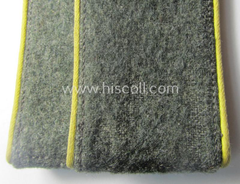 This is a truly attractive - and fully matching and actually not that easily found! - pair of WH (Heeres) early- (ie. mid-) war-period, so-called: 'M40- o. M43'-pattern, enlisted-mens'-type shoulderstraps having the neat bright-yellow- (ie. 'zitronengelber'-) coloured branchcolour as was specifically intended for - and just moderately worn by! - a: 'Soldat eines Heeres Nachrichten-Abteilungs' (or: simple soldier who served within an army-signals unit) and that comes in an overall very nice- (albeit minimally used ie. worn-), condition. The shoulderstraps - which measure approximately 11 cms. in length each - have the 'standard-type'- and/or field-grey-coloured, woolen-based 'upperdecks'. The straps - which have the bright-yellow- (ie. 'zitronengelber'-) coloured- and/or desirable 'silk-like'-type piping attached - come mounted onto their functional tongues: they show as stated above some minimally usage and/or wear only (some minor staining and/or dust is visible and/or present). Simply an attractive and/or: early- (ie. mid-) war-period, 'Heeres'-related EM-type shoulderstrap-pair that was intended for usage by a: 'Soldat eines Heeres Nachrichten-Abteilungs' and that is (I deem) accordingly priced!
