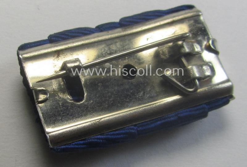 This is a neat two-pieced, WWII-period ribbon-bar (ie. 'Feld- o. Bandspange') respectively showing the ribbons for a: WH (Heeres or Kriegsmarine) so-called: 'Dienstauszeichnung für 12 Jahre Treue Dienste' (or: WH loyal-service medal for twelve years of loyal service) and a: WH (Heeres or Kriegsmarine) so-called: 'Dienstauszeichnung für 4 Jahre Treue Dienste' (or: WH loyal-service medal for 4 years of loyal service) both having a (detailed!) golden- (ie. silver) toned eagle-device attached and that comes in an overall nice- (albeit used- and/or worn, condition. Both ribbons are of the regular (ie. smaller) ribbon-bar-size and measure approximately 1,5 cms. each (as is more often encountered). The 'Spange' comes in a nice condition overall and is of course fully functional: it is, however, not backed with a piece of wool but comes crimped into a metal-based back-plate (as can be seen on the pictures). The attached (and detailed!) 'Auflagen' ie. devices show some minimal age ie. tarnish but have been nicely preserved. This particular example was I deem just moderately worn ie. used: it does show some usage-marks and/or minimal aging ie. wear. Simply an attractive 'Band- o. Feldspange': great to decorate almost any tunic!