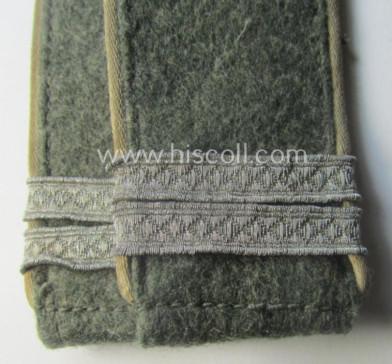 This is an attractive - fully matching and with certainty scarcely encountered! - WH (Heeres), early- (ie. mid-war-) period- (ie. 'M40 o. M43'-pattern) enlisted-mens'-type shoulderstraps as was piped in the desirable white- (ie. 'weisser'-) coloured branchcolour as was specifically intended for - and with certainty worn by! - a: 'Soldat u. Offziers-Anwärter eines Infanterie-Regiments' (or: simple soldier and officers'-candidate who served within one of the army-infanterie regiments) and that comes in an overall very nice- (albeit just moderately used and/or worn-), condition. The (typical 'standard-issued'-pattern) shoulderstraps measure approximately 10,5 cms. in length each and have the 'standard-type'- and/or: field-grey-coloured, woolen-based 'upperdecks' and do show the white- (ie. 'weisser'-) coloured and desirable 'silk-like'-type piping ie. branchcolour attached (as can be see pictures). The straps - which come mounted onto their functional tongues - show as stated above only moderate usage and/or wear (some minor wear, staining and/or dust is visible and/or present). The straps show a (dual) braid-based loop (ie. 'Lasche') each firmly-attached (by means of had-stitching) denoting that the soldier who wore this pair was also an: 'Offiziers-Anwärter' (or: officers'-candidate). This particular shoulderstrap-pair originated from an older cloth- and/or shoulderstrap-collection I recently acquired for the web-site. In any case is this a truly attractive and/or: early-war-period, 'Heeres-Infanterie'-related EM-type shoulderstrap-pair that was intended for usage by a: 'Soldat u. Offziers-Anwärter eines Infanterie-Regiments' and that is with certainty accordingly priced!