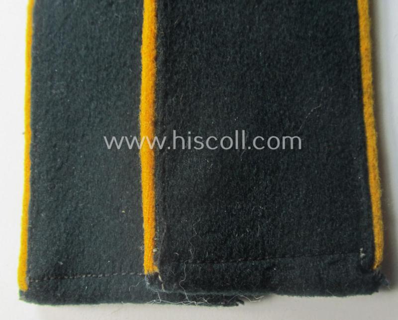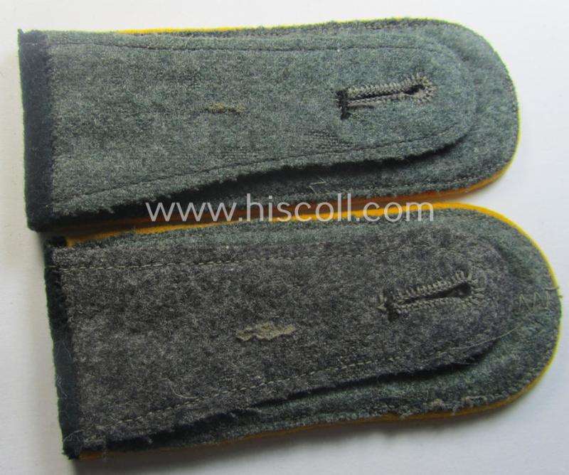 This is an attractive - fully matching and (I deem) pre-war- ie. evt. early-war-period! - pair of 'standard-issued'-pattern, WH (Heeres) early- ie. pre-war period- (ie. 'M36'- ie. 'M40'-pattern and/or: rounded-styled), enlisted-mens'-type shoulderstraps (ie. 'Schulterstücke für Mannschaften des Heeres') as was piped in the desirable golden-yellow- (ie. 'goldgelbener'-) coloured branchcolour as was specifically intended for usage by a: 'Soldat eines Kavallerie- o. Reiter-Regiments' (or: simple soldier who served within one of the cavalry regiments) and that comes in an overall very nice- (ie. I deem just moderately used- ie. worn-), condition. The neat straps - which have the 'standard'-pattern, darker-green-coloured and/or typical 'smooth woolen'-based 'upperdecks' and that measure approximately 11,4 cms. in length each - show the neat golden-yellow- (ie. 'goldgelbener'-) coloured and/or (typical) woolen-type piping attached (as can be seen on the pictures). The pair comes naturally mounted onto their period-attached- (regular-shaped) tongues attached and comes in a very nice- (ie. fully 'text-book') condition overall (as can be seen on the pictures). These type of shoulderstraps are of the fairly early-war-period pattern straps and were worn in the period around 1939/1940 (and were 'worn-out' even during the rest of the war). The pair only shows minimal wear and/or age and is just nicely preserved over the years (as can be seen on the pictures). I deem this an excellent occasion to acquire a neat - and most certainly desirable! - EM-type, 'Kavallerie o. Reiter'-related, Heeres-EM-type shoulderstrap-pair for a justified price!