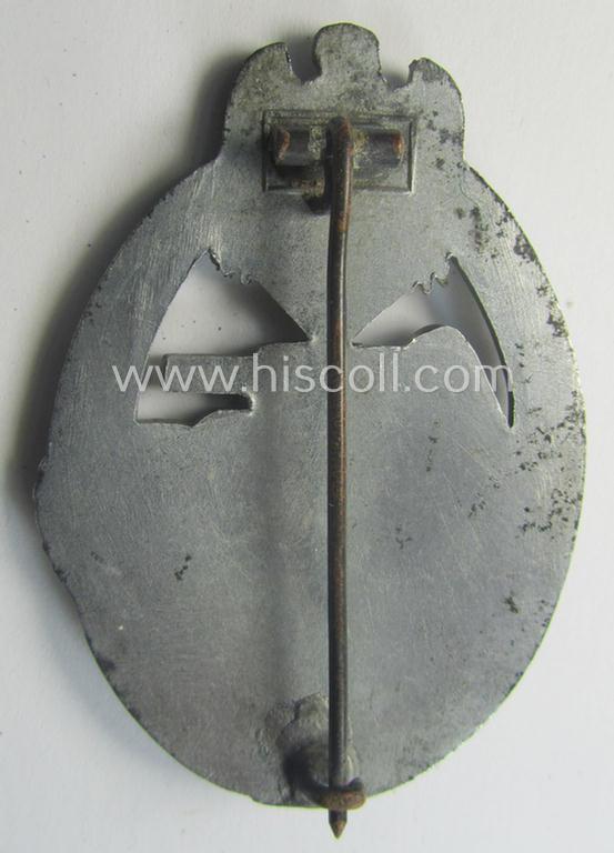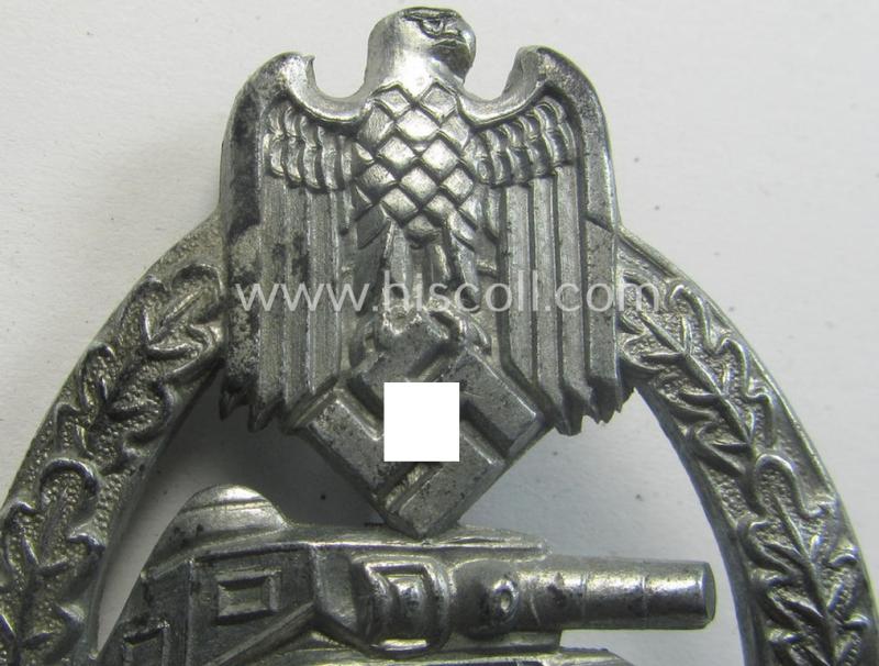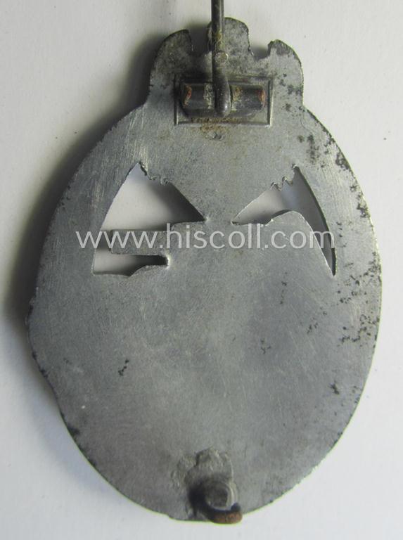 This is a very attractive - and I deem just minimally used and actually not that easily found! - example of a so-called: 'Panzerkampfabzeichen in Silber' (or: silver-class panzer-assault badge or PAB) being a typical, non-maker-maker-marked- and/or zinc- (ie. 'Feinzink'-) based specimen of the so-called: 'scooped flatback'-pattern (as was produced by a to date still unidentified maker) and that comes in an overall very nice- (and I deem just minimally used- ie. worn-), condition. The badge on offer here concerns (I deem) a mid- (ie. later-) war-period, zinc- ie. 'Feinzink'-based specimen that truly retains most of its (bright) silver-coloured finish (something that is most certainly not that often seen!). The piece retains, moreover, a very attractive appearance that still shows pronounced detail as to be expected by a badge of this specific pattern. The badge has never been cleaned nor polished (and is still also a tiny bit dirty ie. stained- ie. tarnished as mentioned above). It was recently found as such at a German private-household and was never before part of a collection. The piece comes naturally mounted onto its fully functional (and unaltered) pin- and/or catch(set-up) as can be seen on the pictures. Simply a very attractive example of the 'scooped flatback'-pattern that is I deem accordingly priced!