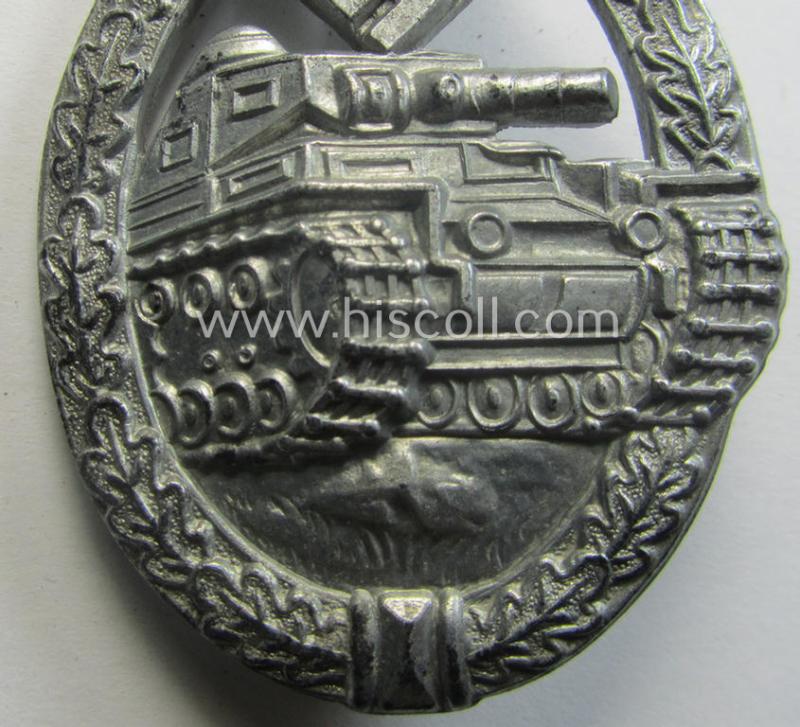 'Panzerkampfabzeichen in Silber' (or: silver-class panzer-assault badge or PAB) being a typical non-maker-marked- and/or zinc- (ie. 'Feinzink'-) based specimen of the 'scooped flatback'-pattern