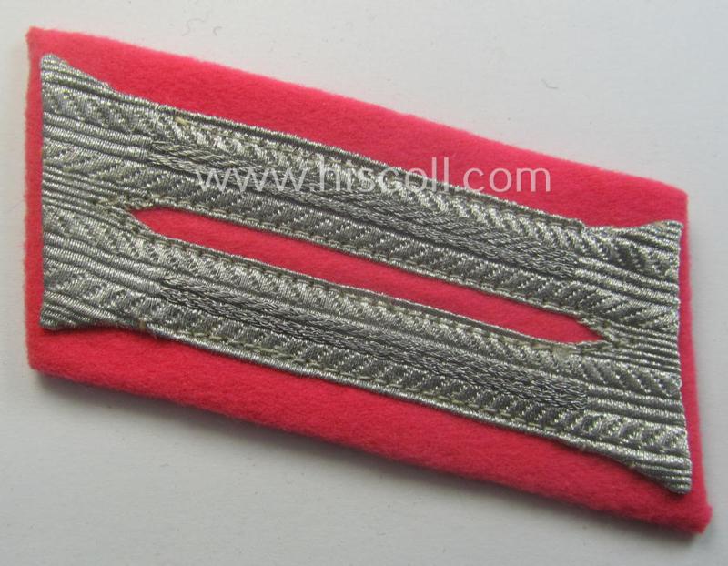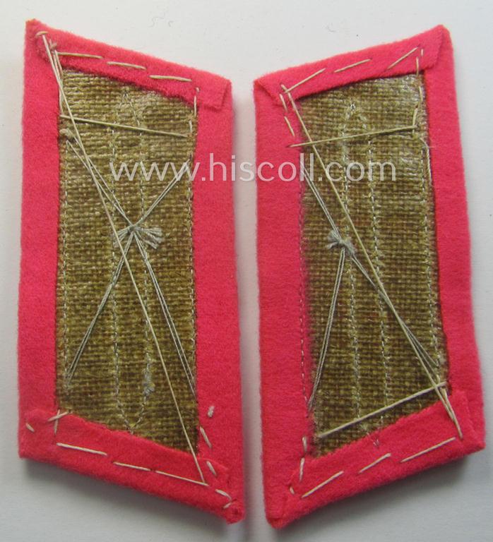 This is an attractive - and I deem 'virtually mint- ie. unissued'! - pair of neatly executed and fully matching, WH (Heeres) enlisted-mens'- (ie. NCO-) type, so-called: 'Waffenrock'- (ie. dress-) collar-tabs (ie. 'Kragenspiegel für Waffenrock') as piped in the (scarcely seen!) bright-pink- (ie. 'rosaroter'-) coloured branchcolour as was intended for usage by a: 'Soldat o. Unteroffizier eines Panzer- o. Panzerjäger-Abteilungs o. Regiments' (or: simple soldier or NCO who served within an army tank ie. tank-destroyer-unit) and that comes in an overall very nice- (ie. I deem simply never used- nor once-tunic-attached-), condition. The pair - which is of the specific pattern that was used on the WH-dress-tunics or: 'Waffenröcke' - is piped in the neat bright-pink- (ie. 'rosaroter'-) branchcolour. The pieces are fully identical in execution and are nicely 'backed' with 'buckram'-based material as to be expected (as can be seen on the pictures). The pair shows extraordinary quality and is fully void of any corrosion but does show some (minimal) storage-age only. In any case is this a very attractive, 'Heeres-Panzer o. Panzerjäger'-related EM- (ie. NCO'-) type 'Waffenrock'-insignia-set as was intended for usage by a: 'Soldat o. Unteroffizier eines Panzer- o. Panzerjäger-Abteilungs o. Regiments': impossible to upgrade this attractive pair!