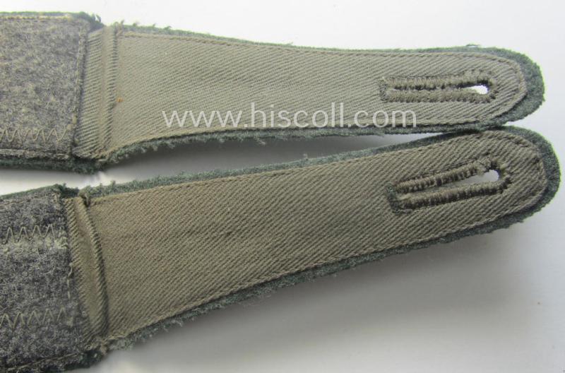 This is an attractive - fully matching and actually scarcely found! - pair of WH (Heeres), early- (ie. pre-) war-period, 'M36- o. M40'-pattern (pointed-styled- and neatly 'cyphered') enlisted-mens'-type shoulderstraps (being a pair having no branchcolour ie. piping as per regulation) as was intended for usage by a: 'Soldat des Infanterie-Regiments 79' (or: simple soldier who served within the army-infantry-regiment, numbered: '79') and that comes in overall nice- (albeit just moderately used- and/or worn-), condition. The neat straps - which are both approximately 12,5 cms. sized in length - have the 'standard-pattern' and/or: dark-green-coloured- and (smooth)woolen-based 'upperdecks' and have as stated above no piping nor branchcolour attached: they are of the 'generic pattern' (as can be seen on the pictures). Moreover, do they show the neat, white- (ie. 'weisser'-) coloured and/or neatly machine-embroidered: '7'- and '9'-numerals ie. cyphers ('Ziffern') (which are executed in so-called: 'Kurbelstickerei' as to be expected). The pair comes mounted onto its original tongues and does just show some truly minimal age-, wear and/or staining: one of the straps shows a tiny moth-hole (as can be seen on the pictures). Simply a neat - and I deem quite early- (ie. pre- or early-) war-period - 'Heeres' EM-type, shoulderstrap-pair that belonged to a: 'Soldat des Infanterie-Regiments 79': I deem that I have priced this attractive - and with certainty desirable! - infantry EM-pair, accordingly!