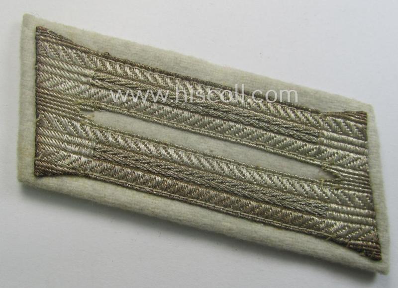 This is an attractive - and I deem simply never used ie. still 'virtually mint- ie. unissued'! - pair of neatly executed and fully matching, WH (Heeres) enlisted-mens'- (ie. NCO-) type, so-called: 'Waffenrock'- (ie. dress-) collar-tabs (ie. 'Kragenspiegel für Waffenrock') as piped in the white- (ie. 'weisser'-) coloured branchcolour as was intended for usage by a: 'Soldat o. Unteroffizier eines Infanterie-Regiments' (or: simple soldier or NCO who served within an army infantry-unit) and that comes in an overall very nice- (ie. I deem simply never used- nor once-tunic-attached-), condition. The pair - which is of the specific pattern that was used on the WH-dress-tunics or: 'Waffenröcke' - is piped in the neat white- (ie. 'weisser'-) branchcolour. The pieces are fully identical in execution and are nicely 'backed' with 'buckram'-based material as to be expected (as can be seen on the pictures). The pair shows extraordinary quality and is fully void of any corrosion but does show some (minimal) storage-age only. In any case is this a very attractive, 'Heeres-Infanterie'-related EM- (ie. NCO'-) type 'Waffenrock'-insignia-set as was intended for usage by a: 'Soldat o. Unteroffizier eines Infanterie-Regiments': impossible to upgrade this attractive pair!