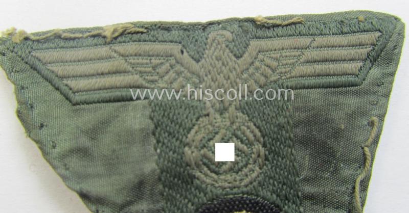 This is a neat - and truly used- ie. most certainly once cap-attached! - example of a WH (Heeres) so-called: 'M42-pattern' cap-eagle/cocarde (ie. cap-trapezoid) as was specifically produced for usage on the (impopular) 'M-42'-model side-caps (ie. 'Schiffchen') and that comes in an overall very nice- (ie. clearly used- and/or minimally stained-), condition. The piece - which was carefully confectioned and folded but not trimmed - is executed in the so-called: 'BeVo'-weave-pattern (as to be expected): the eagle still shows some of the stitching-remains (ie. holes) but is totally void of any damage or alike. These cap-eagles - which were as stated above specifically produced for usage on the (impopular) 'M-42'-model side-caps (ie. 'Schiffchen') - were also used on the much more popular 'M43'-model caps (ie. 'Einheitsfeldmützen'). The piece on offer here is executed in bluish-grey-coloured linnen on a field-grey-coloured (and/or also linnen-based-) background (as can be seen on the pictures). This particular piece originates from the USA where it was once brought as so-called: 'vet-bring-back'-souvenir. Simply a nice occasion to aquire an attractive - clearly used! - and nicely 'BeVo'-woven, T-shaped 'M42'-cap-trapezoid for a competitive price!