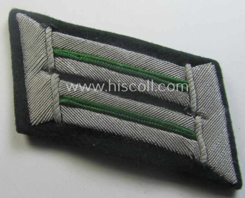 This is an attractive - and fully matching and actually very hard to find! - pair of (I deem somewhat early- ie. mid-war-period!) 'standard-issue'-pattern and neatly hand-embroidered, officers'-type collar-tabs (ie. 'Kragenspiegel für Offiziere') as piped in the bright-green- (ie. 'hellgrüner'-) coloured branchcolour as was intended for usage by an: 'Offizier der Panzer-Grenadier-Truppen' (or: officer who served within an infantry-related rifle-unit or regiment) and that comes in an overall very nice- (ie. just moderately used- ie. I deem once tunic-attached-), condition. The bright-green piped pair - which is neatly 'backed' with reddish-coloured carton-based material as more often observed - is neatly hand-embroidered in silver-toned braid (as can be seen on the pictures). The pair was presumably once tunic-attached (by means of hand-stitching) and was carefully tunic-removed: it shows some truly minimal staining caused by minimal wear and/or decades of storage (as can be seen on the pictures). Simply a very attractive - and truly not that easily found! - WH (Heeres) collar-tab-pair that was intended for an: 'Offizier der Panzer-Grenadier-Truppen' and that will be hard to be upgraded!