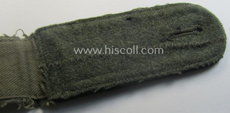 This is an attractive - albeit regrettably single but nevertheless scarcely seen! - (I deem) early- (ie. mid-war-) period, so-called: 'M41 o. M43'-pattern, neatly 'cyphered' WH (Heeres) enlisted-mens'-type shoulderstrap as was piped in the black- (ie. 'schwarzer'-) coloured branchcolour as was intended for a: 'Soldat u. Mitglied des Pionier-Abteilungs 54' (or simple soldier who served witin the army-engineers unit, numbered: '54') and that comes in an overall very nice- (I deem clearly issued- and/or: just moderately used- ie. worn-), condition. The shoulderstrap - which measures approximately 11,8 cms. in length as more often seen - has the neat (and desirable!) 'silk-like'-type piping attached (as is more encountered with these early- (ie. mid-) war-period shoulderstraps). The shoulderstrap - which originates from a larger cloth- and insignia-collection I recently acquired for the web-site - shows the neat (machine-embroidered by means of so-called: 'Kurbelstickerei'-) so-called: '5'- and/or: '4' cyphers ie. numerals. These 'cyphers' are executed in the black- (ie. 'schwarzer'-) coloured wool ie. linnen as to be expected and comes mounted onto its functional tongue (as can be noticed on the pictures). Simply an attractive - and/or fully 'text-book'! - 'M41- o. M40'-pattern, EM-type, 'Pioniere'-related shoulderstrap that was intended for usage by a: 'Soldat u. Mitglied des Pionier-Abteilungs 54': too bad that it is only a single specimen!