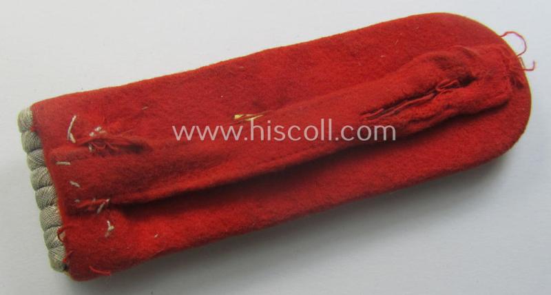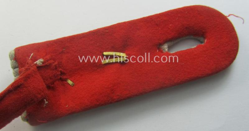 This is an attractive - clearly used and regrettably single but nevertheless quite scarcely encountered! - WH (Heeres) neatly 'cyphered', officers-pattern shoulderboard as piped in the bright-red- (ie. hochroter-) coloured branchcolour as was as intended for - and just moderately used by! - an: 'Oberleutnant u. Mitglied einer Artillerie-Beobachtungs-Abteilungs' (or: lieutnant first-class who served within a specific, artillery-observers' unit) and that comes in an overall nice- (albeit clearly- ie. moderately used and/or worn- ie. carefully tunic-removed-), condition. The shoulderboard which is approximately 10 cms. sized in length and that is piped in the neat bright-red- (ie. hochroter-) coloured branchcolour as to be expected shows a neat (bright golden-coloured, 'Buntmetall'-based, Gothic-styled- and/or: larger-sized) so-called: 'B'-cypher (ie. 'Ziffer') and equally-styled and regular-sized pip period-attached denoting that the strap was intended for a junior-officer who held the rank of an: 'Oberleutnant' (ie. lieutnant first-class). Both devices show some regular age and/or minimal tarnish but are both still nicely preserved. The strap comes mounted onto its functional (smaller-sized) tongue and does show some moderate age, wear and/or staining (as can be seen on the pictures). The piece was never before in collectors'-hands and was recently found as such. Simply an attractive 'Heeres' officers'-type shoulderstrap that belonged to an: 'Oberleutnant u. Mitglied einer Artillerie-Beobachtungs-Abteilungs': too bad that it is only a single specimen!
