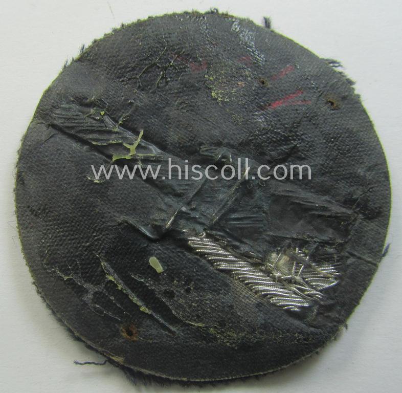 This is a very attractive - and I deem just minimally used- and/or worn but nevertheless truly rarely found! - example of a WH (Luftwaffe) hand-embroidered, so-called: trade- ie. special-career-patch (ie. 'Tätigkeitsabzeichen') of the first pattern showing a bright silver-toned illustration of a 88cms. Flak-canon (ie. 'Flakgeschützrohr') as was specifically intended for staff-members serving within the: 'Flakartillerie-Truppen' (or: anti-aircraft-troops) and that comes in an overall very nice- (and presumably worn- ie. once tunic-attached-), condition. These rarely seen trade-patches (the first pattern) were instituted in October 1936 and saw only limited usage: just one year later they were replaced by the more commonly encountered 2nd. pattern 'Flakartillerie-Tätigkeitsabzeichen'. The neat - and truly quality-produced! - badge on offer here shows a additionally-added linnen-based and black-coloured 'backing' and is very nicely hand-embroidered on a LW bluish-grey-coloured- and/or woolen-based (ie. officers-type!) background and shows some minor staining and/or moderate wear. These badges ranked actually amongst the 'award-category' and came together with an official award-document and had to be properly entered in both 'Soldbuch' and 'Wehrpass'. Simply an attractive - and truly not that often encountered! - LW-'Tätigkeits-Abzeichen' of the 'Extra Qualität' that is with certainty accordingly priced!