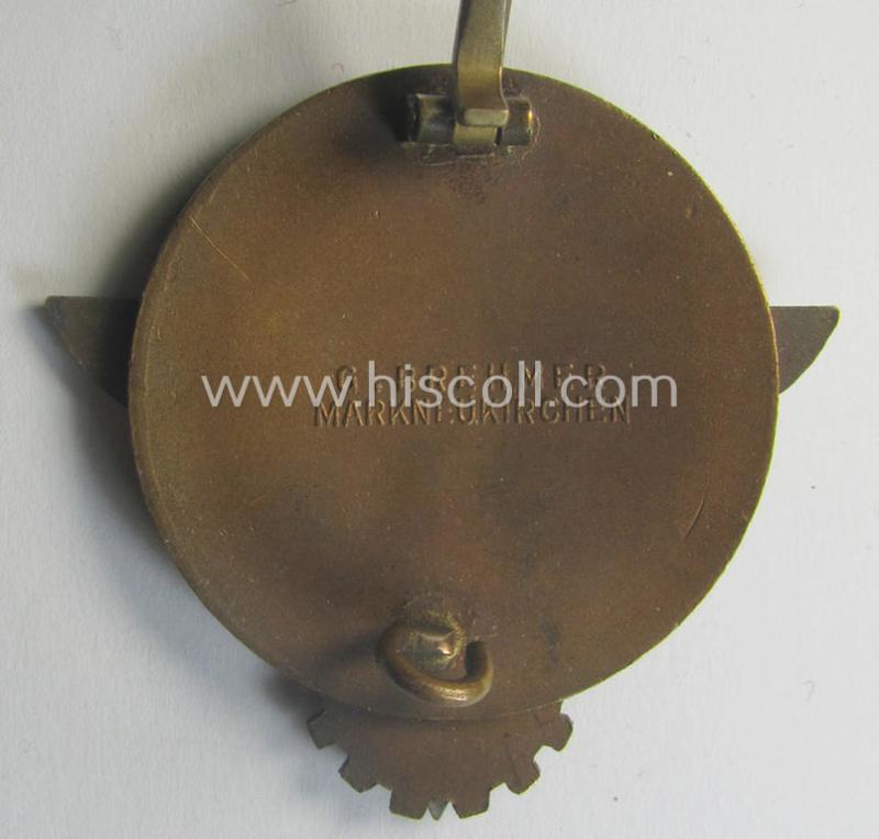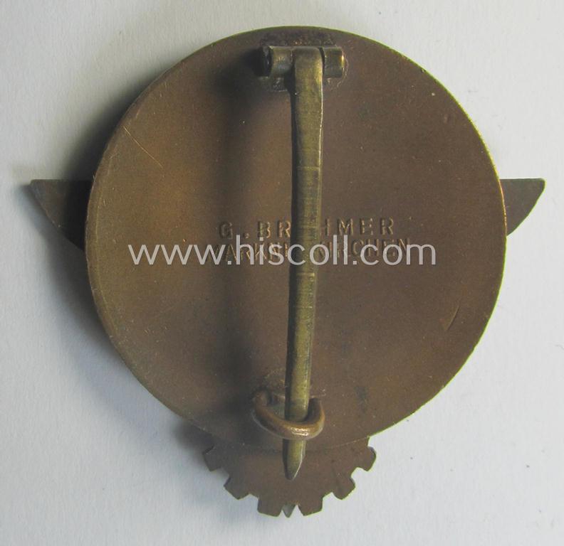 This is a very attractive - truly nicely preserved and actually not that easily encountered! - 'HJ'- ('Hitlerjugend') ie. 'BDM'- ('Bund Deutscher Mädel') related, so-called: 'Reichsberufswettkampf-Siegerabzeichen' being a high-quality (ie. typical 'Buntmetall'-based!) and neatly maker-marked award (of the 2nd model) bearing the text: 'Kreissieger 1938' and that comes in an overall very nice- (albeit minimally worn- and/or used-), condition. The attractive badge is (as stated above) executed in high-quality, golden-bronze- ie. copper-toned metal (ie. 'Buntmetall') and is nicely maker-marked on its back with the makers'-designation of the maker: 'G.Brehmer - Markneukirchen' (as can be seen on the pictures). The badge comes in a just moderately used- ie. worn condition but is totally void of enamel-damage as can be seen on the pictures). It is furthermore just a tiny bit tarnished ie. dusty caused by normal age (as can be seen on the pictures). The badge comes naturally mounted onto its (fully functional- and totally unaltered!) catch and/or functional pin- (ie. catch) attachment. The badge has a wonderful appearance and has never been cleaned nor polished. Simply an attractive 'youth-related'-award that is - I deem - priced according to its very nice and totally untouched, condition!